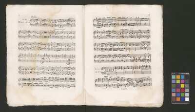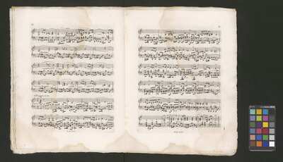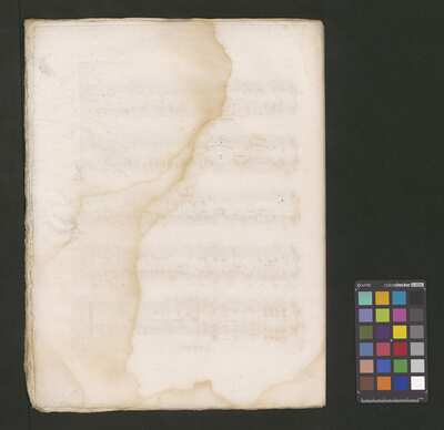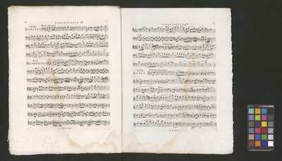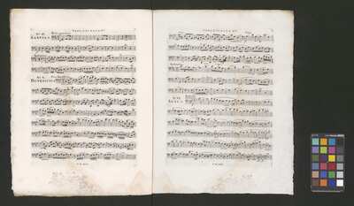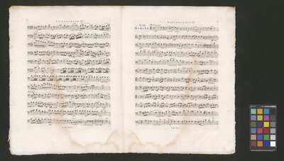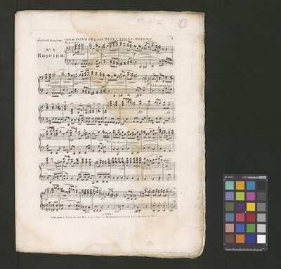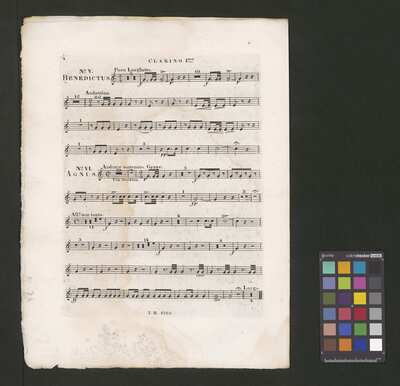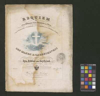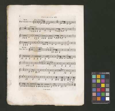 At the title page bookseller's stamp: "Marco Berra" and old shelfmark "59/1"., Material: 52 + 2 f., Auf dem Titelblatt aufgeklebt gedrucktes Etikett: "Stuttgart, bei G. A. Zumsteeg.", [pl-text: Brak partii T1, T2, B1; w druku zachowana jedynie partia B2.], [pl-text: Do druku dołączone spisane ręcznie partie vla 1 (6f.) i vla 2 (6f.); spisane przez jednego kopistę. Foliacja na kartach naniesiona ołówkiem.], [pl-text: Na karcie tytułowej rozmazana czarna owalna pieczęć (widoczna także na pierwszej stornie partii B2). W prawym górnym rogu ołówkiem naniesiony numer "141". Pod nadrukiem sugerującym cenę czerwonym ołówkiem naniesione "24.".], [pl-text: Pieczęć: „ARCHIWUM I BIBLIOTEKA”, „Krakowskiej Kapituły Katedralnej” wraz z wpisaną ołówkiem sygnaturą na odwrocie karty tytułowej. Pieczęć: „CATH. CRAC. * ARCH. CAPIT.” na pierwszej lub drugiej stronie każdej partii (w przypadku partii spisanych na f. 1r).], [pl-text: Na pierwszej stronie każdego głosu naniesiona ołówkiem sygnatura.], [pl-text: Większość kart druku nosi ślady zalania, na niektórych widoczne ślady pleśni.]