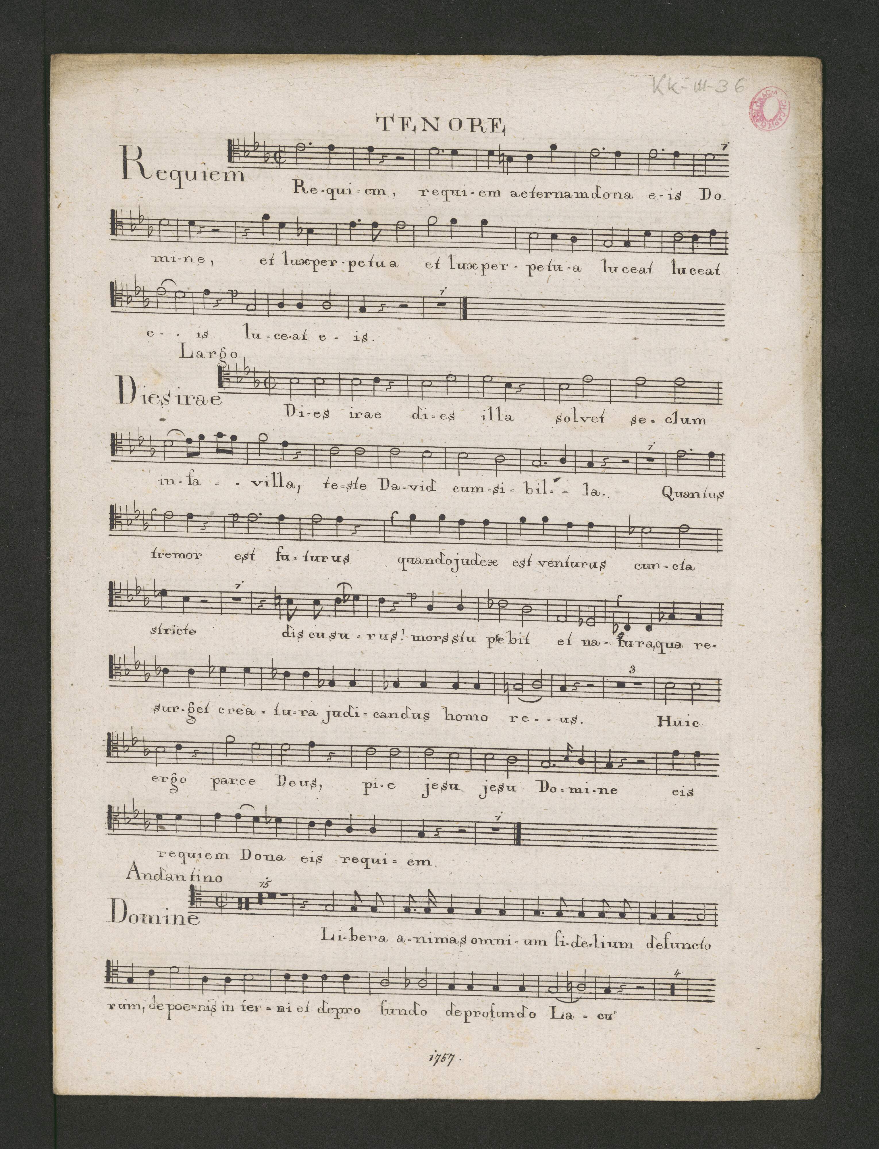 [cor 2, title page:] REQUIEM | a Canto, Alto, Tenor et Basso. | Violino Primo, | Violino Secundo, | Corno Primo, | Corno Secundo, | con Organo | Authore | JOH: BAPT: SCHIEDERMAYR | Vienna | Nel Magazino C: R: r: Stamperia chimica sul Graben N|o 612 | N|o 1757. [...]