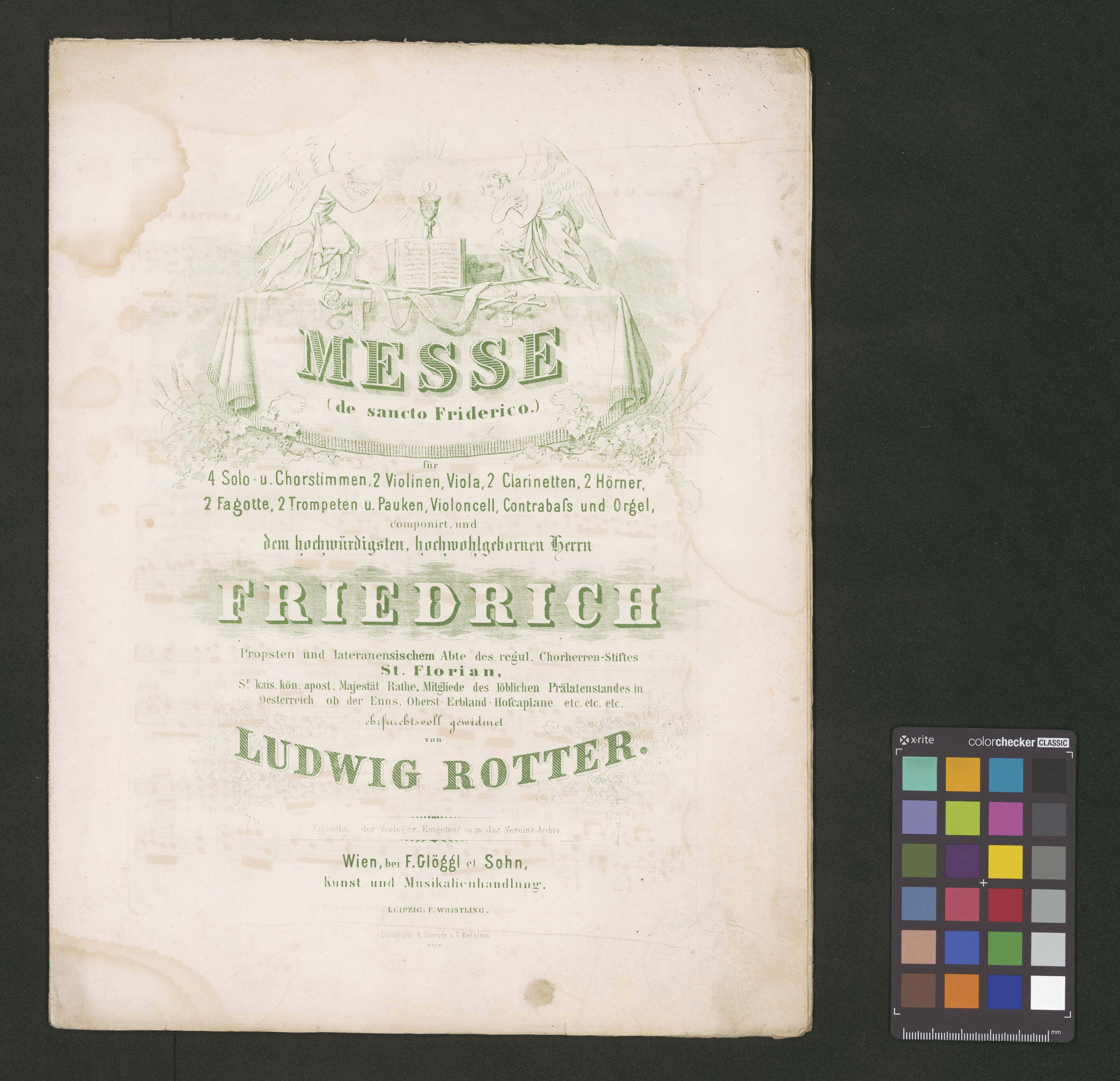 [org, p. 1:] MESSE │ (de sancto Friderico.) │ für │ 4 Solo u. Singstimmen, 2 Violinen, Viola, 2 Clarinetten, 2 Hörner, │ 2 fagotte, 2 Trompeten u. Pauken, Violoncell, Contrabass und Orgel, │ componirt, und │ dem hochwürdigsten, hochwohlgebornen Herrn │ FRIEDRICH │ Propsten und lateranensischen Abte des regul. Augustiner Chorherrenstiftes │ St. Florian. │ Sr kais. kön. apost. Majestät Rathe, Mitglied des löblichen Prälatenstandes in │ Oesterreich ob der Enns, Oberst Erbland- und Hof-Caplane │ etc. etc. etc. │ ehrfurchtsvoll gewidmet │ von │ LUDWIG ROTTER. │ Eigenthum der Verleger Eingetragen in das Vereins-Archiv │ Wien, bei F. Glöggl et Sohn, │ Kunst und Musikalienhandlung. │ LEIPZIG, F. WHISTLING. │ Lithografie. & Steindr. v. G. Wegelein. │ WIEN