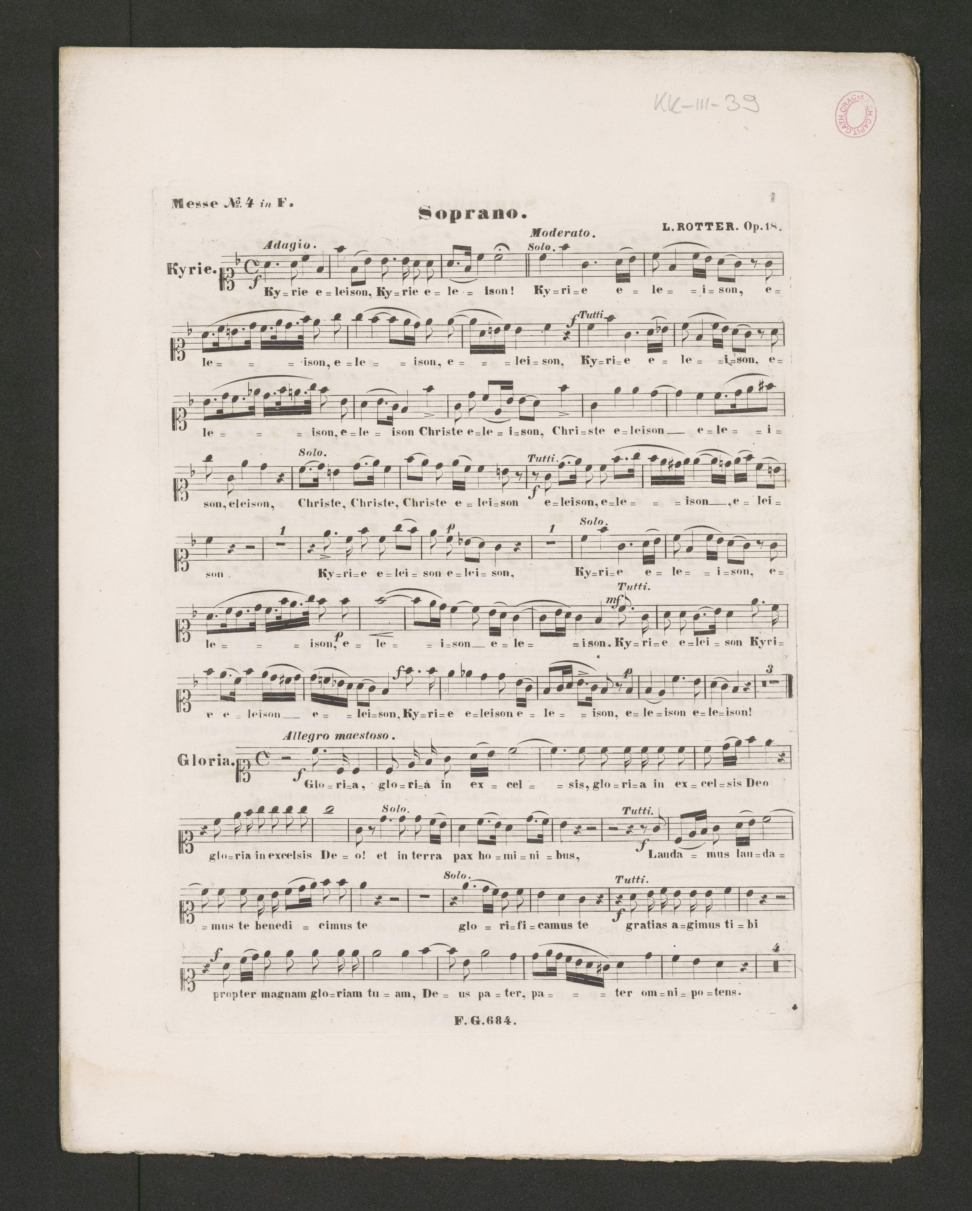 [org, p. 1:] MESSE │ (de sancto Friderico.) │ für │ 4 Solo u. Singstimmen, 2 Violinen, Viola, 2 Clarinetten, 2 Hörner, │ 2 fagotte, 2 Trompeten u. Pauken, Violoncell, Contrabass und Orgel, │ componirt, und │ dem hochwürdigsten, hochwohlgebornen Herrn │ FRIEDRICH │ Propsten und lateranensischen Abte des regul. Augustiner Chorherrenstiftes │ St. Florian. │ Sr kais. kön. apost. Majestät Rathe, Mitglied des löblichen Prälatenstandes in │ Oesterreich ob der Enns, Oberst Erbland- und Hof-Caplane │ etc. etc. etc. │ ehrfurchtsvoll gewidmet │ von │ LUDWIG ROTTER. │ Eigenthum der Verleger Eingetragen in das Vereins-Archiv │ Wien, bei F. Glöggl et Sohn, │ Kunst und Musikalienhandlung. │ LEIPZIG, F. WHISTLING. │ Lithografie. & Steindr. v. G. Wegelein. │ WIEN