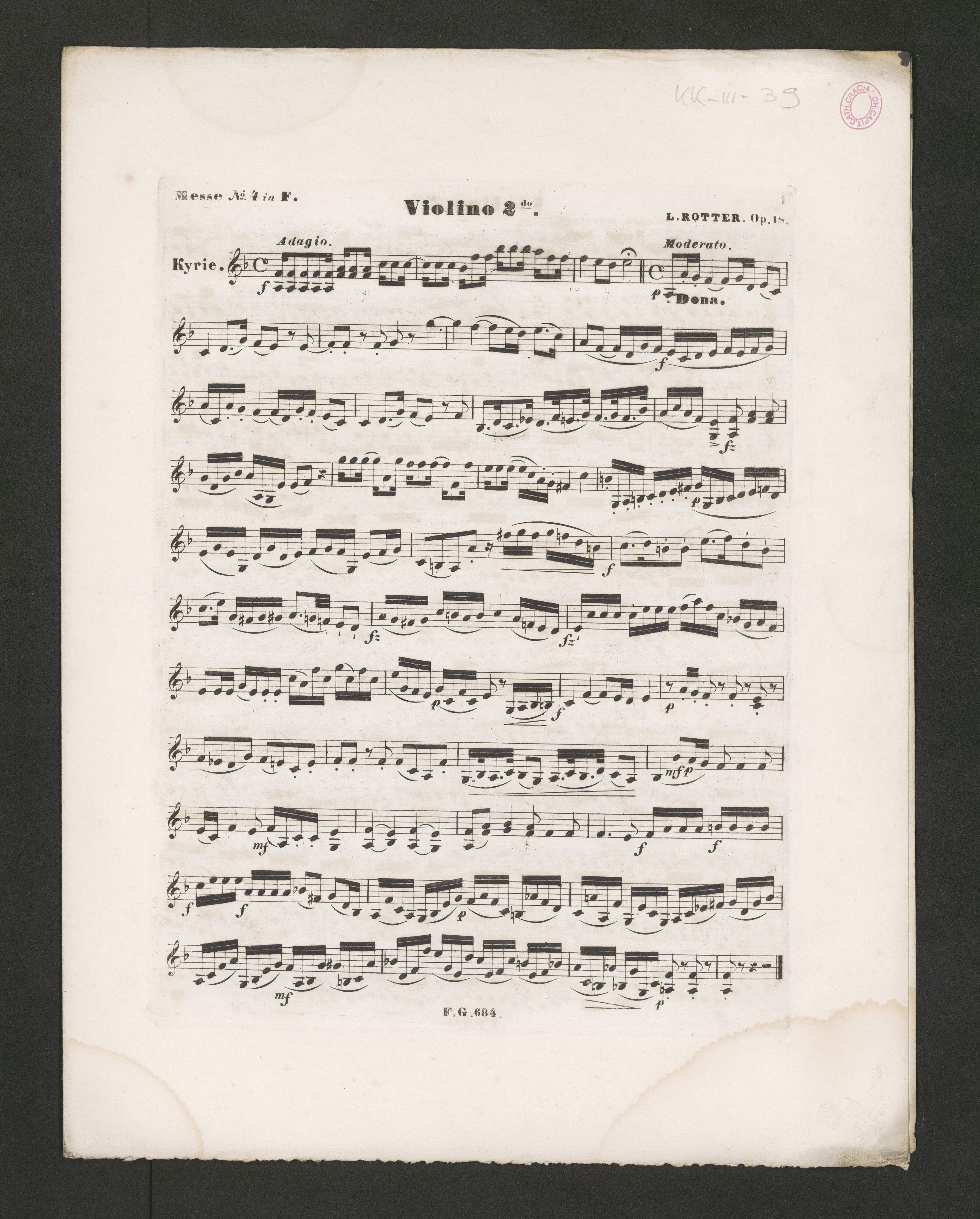 [org, p. 1:] MESSE │ (de sancto Friderico.) │ für │ 4 Solo u. Singstimmen, 2 Violinen, Viola, 2 Clarinetten, 2 Hörner, │ 2 fagotte, 2 Trompeten u. Pauken, Violoncell, Contrabass und Orgel, │ componirt, und │ dem hochwürdigsten, hochwohlgebornen Herrn │ FRIEDRICH │ Propsten und lateranensischen Abte des regul. Augustiner Chorherrenstiftes │ St. Florian. │ Sr kais. kön. apost. Majestät Rathe, Mitglied des löblichen Prälatenstandes in │ Oesterreich ob der Enns, Oberst Erbland- und Hof-Caplane │ etc. etc. etc. │ ehrfurchtsvoll gewidmet │ von │ LUDWIG ROTTER. │ Eigenthum der Verleger Eingetragen in das Vereins-Archiv │ Wien, bei F. Glöggl et Sohn, │ Kunst und Musikalienhandlung. │ LEIPZIG, F. WHISTLING. │ Lithografie. & Steindr. v. G. Wegelein. │ WIEN