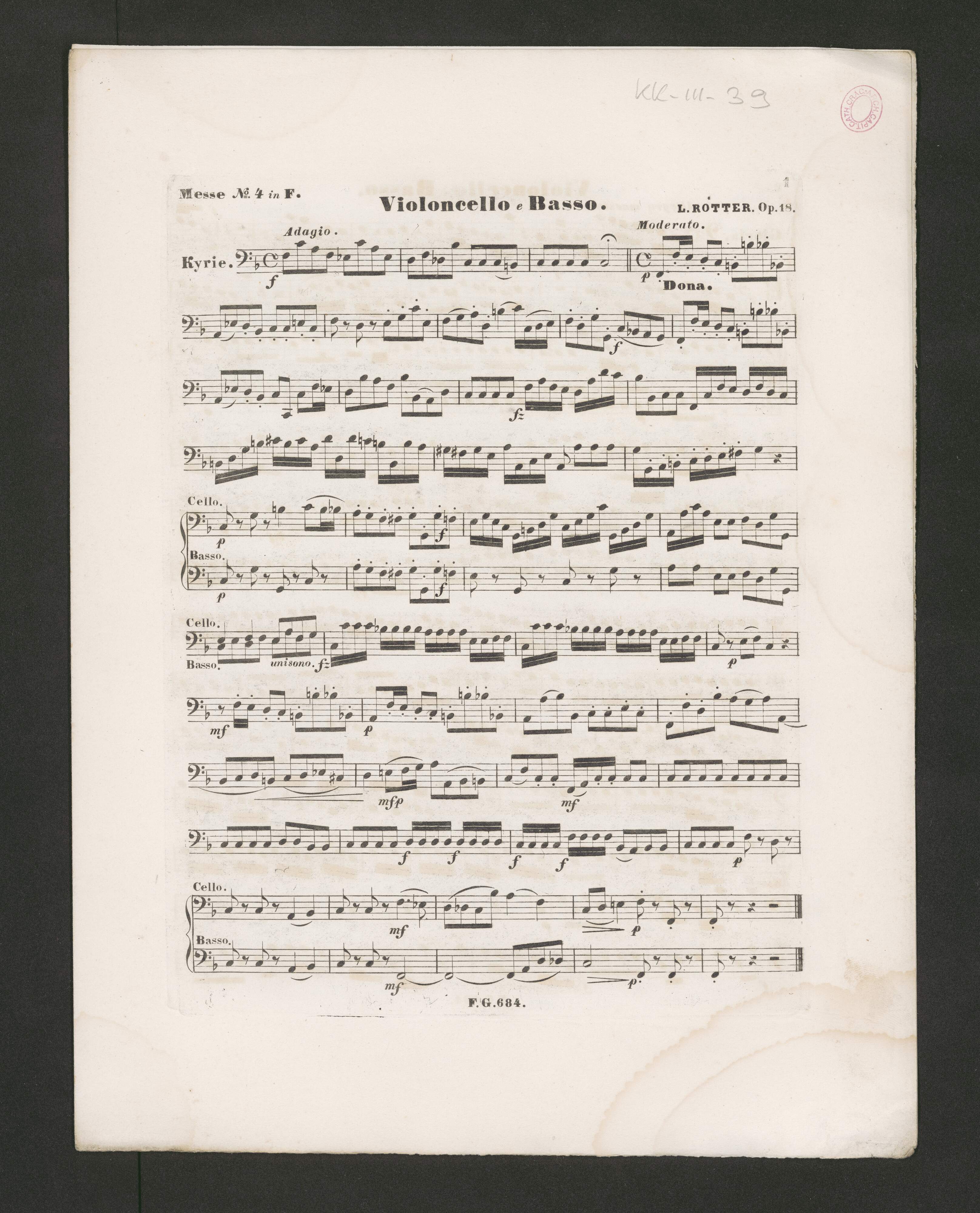 [org, p. 1:] MESSE │ (de sancto Friderico.) │ für │ 4 Solo u. Singstimmen, 2 Violinen, Viola, 2 Clarinetten, 2 Hörner, │ 2 fagotte, 2 Trompeten u. Pauken, Violoncell, Contrabass und Orgel, │ componirt, und │ dem hochwürdigsten, hochwohlgebornen Herrn │ FRIEDRICH │ Propsten und lateranensischen Abte des regul. Augustiner Chorherrenstiftes │ St. Florian. │ Sr kais. kön. apost. Majestät Rathe, Mitglied des löblichen Prälatenstandes in │ Oesterreich ob der Enns, Oberst Erbland- und Hof-Caplane │ etc. etc. etc. │ ehrfurchtsvoll gewidmet │ von │ LUDWIG ROTTER. │ Eigenthum der Verleger Eingetragen in das Vereins-Archiv │ Wien, bei F. Glöggl et Sohn, │ Kunst und Musikalienhandlung. │ LEIPZIG, F. WHISTLING. │ Lithografie. & Steindr. v. G. Wegelein. │ WIEN