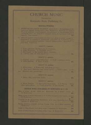 [pl-text: Na ostatniej stronie okładki znajduje się katalog wydawnictwa.], [pl-text: W górnym brzegu okładki spisany ołówkiem numer "722" oraz "217".], [pl-text: Na okładce znajduje się prostokątna pieczątka: "B. J. ZALEWSKI, MUSIC PUBLISHER & IMPORTER. * 1505 Tell Place (Wicker Park Station) Chicago, Ill. U. S. A.."; w lewym górnym rogu pieczątki (mniejszymi literami): "ESTABLISHED | ZAŁOŻONE 1900"; w prawym górnym rogu: "TELEPHONE | ARMITAGE 21 (dwie ostatnie cyfry rozmazane)".], [pl-text: Na drugiej stronie okładki pieczęć: „ARCHIWUM I BIBLIOTEKA”, „Krakowskiej Kapituły Katedralnej” wraz z wpisaną ołówkiem sygnaturą. Pieczęć: „CATH. CRAC. * ARCH. CAPIT.” na str. 9.]