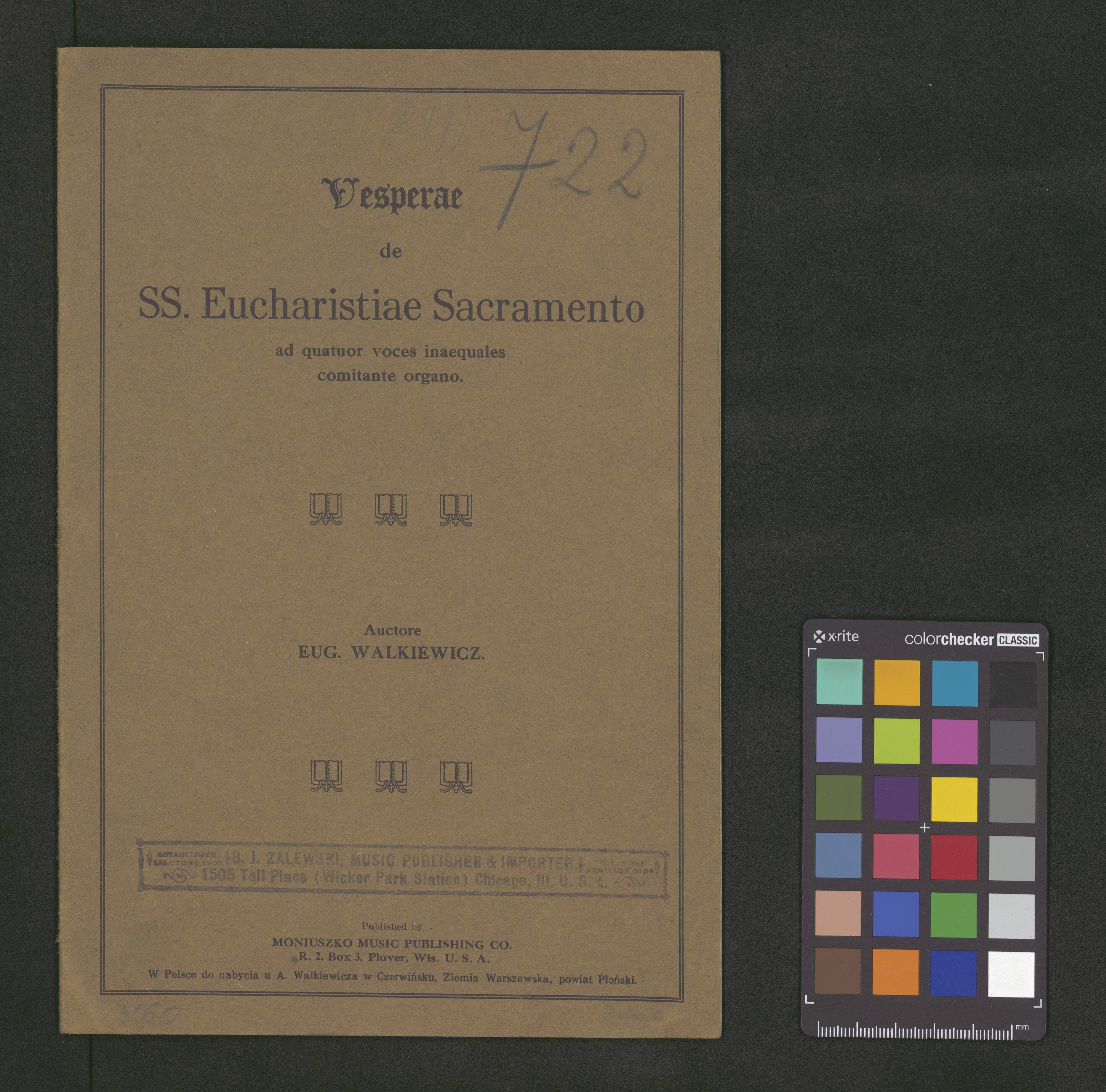 [on the cover:] Vesperae | de | SS. Eucharistiae Sacramento | ad quator voces inaequales | comitante organo. | Autore | EUG. WALKIEWICZ. | Published by | MONIUSZKO MUSIC PUBLISHING CO. | R. 2, Box 3, Plover, Wis. U. S. A. | W Polsce do nabycia u A. Walkiewicza w Czerwińsku, Ziemia Warszawska, powiat Płoński