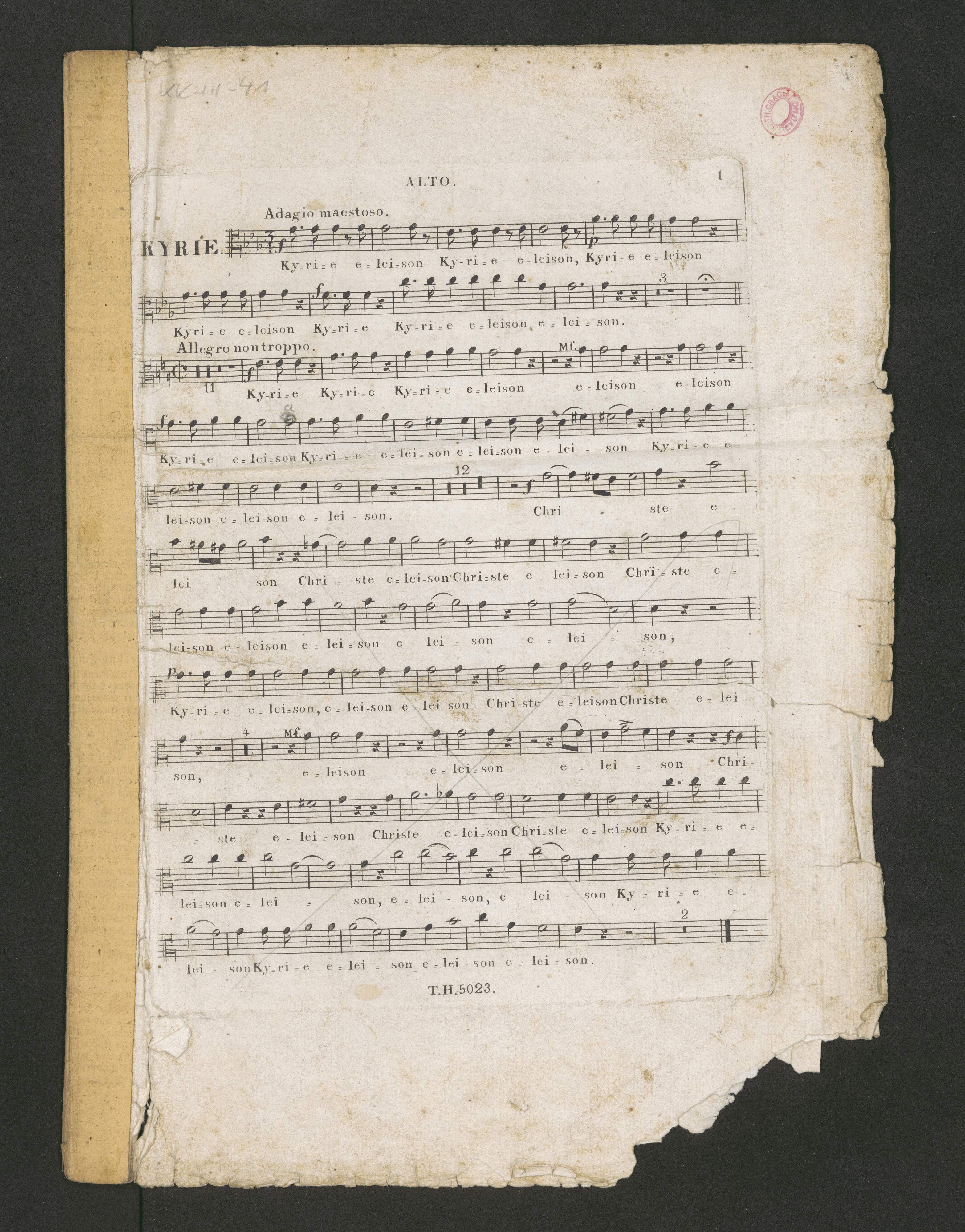 [title page/first page of org part:] Dreyzehnte | MESSE | (Für das heilige Oster=Fest.) | für vier Singstimmen, | 2 Violinen, 2 Clarinetten, 2 Trompeten, | Pauken, Contrabas und Orgel | von | JOH. B. SCHIEDERMAYR, | Dom-Organisten in Linz. | 66|tes| Werk. | 52|te| Lieferung der Kirchen-Musikalien. | N|o| 5023 [...] | Wien bey Tobias Haslinger | Musikverleger | im Hause der ersten österr Sparkasse | am Grauben N|o|572
