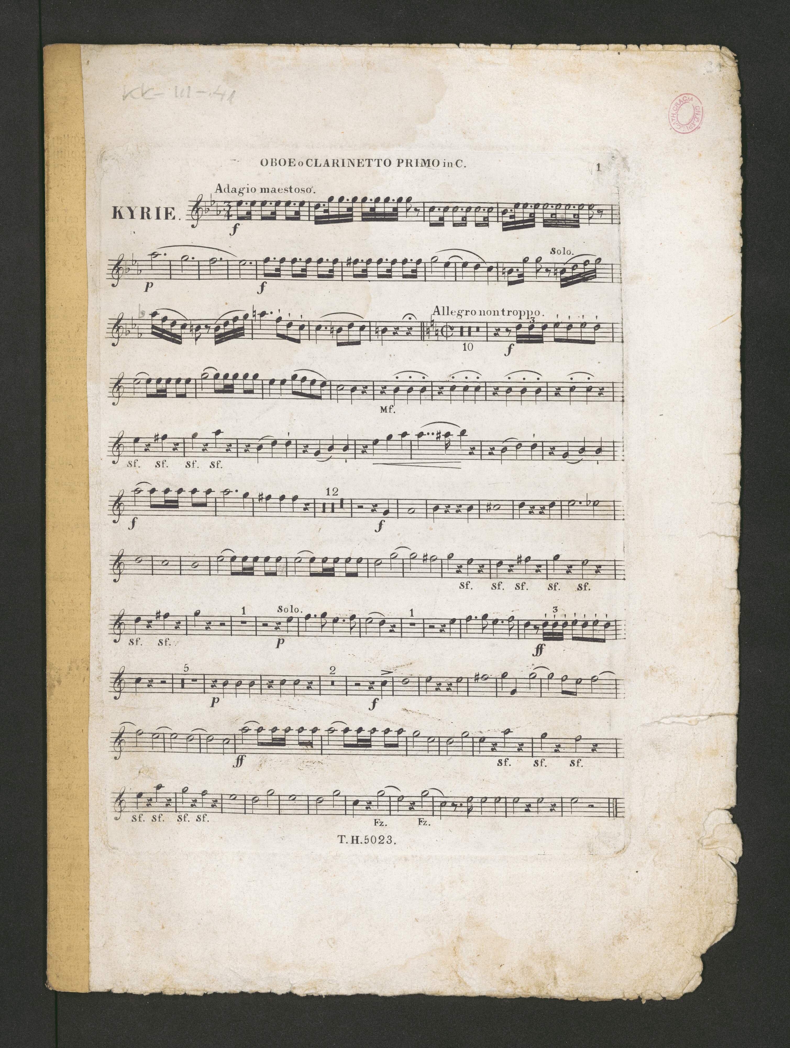 [title page/first page of org part:] Dreyzehnte | MESSE | (Für das heilige Oster=Fest.) | für vier Singstimmen, | 2 Violinen, 2 Clarinetten, 2 Trompeten, | Pauken, Contrabas und Orgel | von | JOH. B. SCHIEDERMAYR, | Dom-Organisten in Linz. | 66|tes| Werk. | 52|te| Lieferung der Kirchen-Musikalien. | N|o| 5023 [...] | Wien bey Tobias Haslinger | Musikverleger | im Hause der ersten österr Sparkasse | am Grauben N|o|572