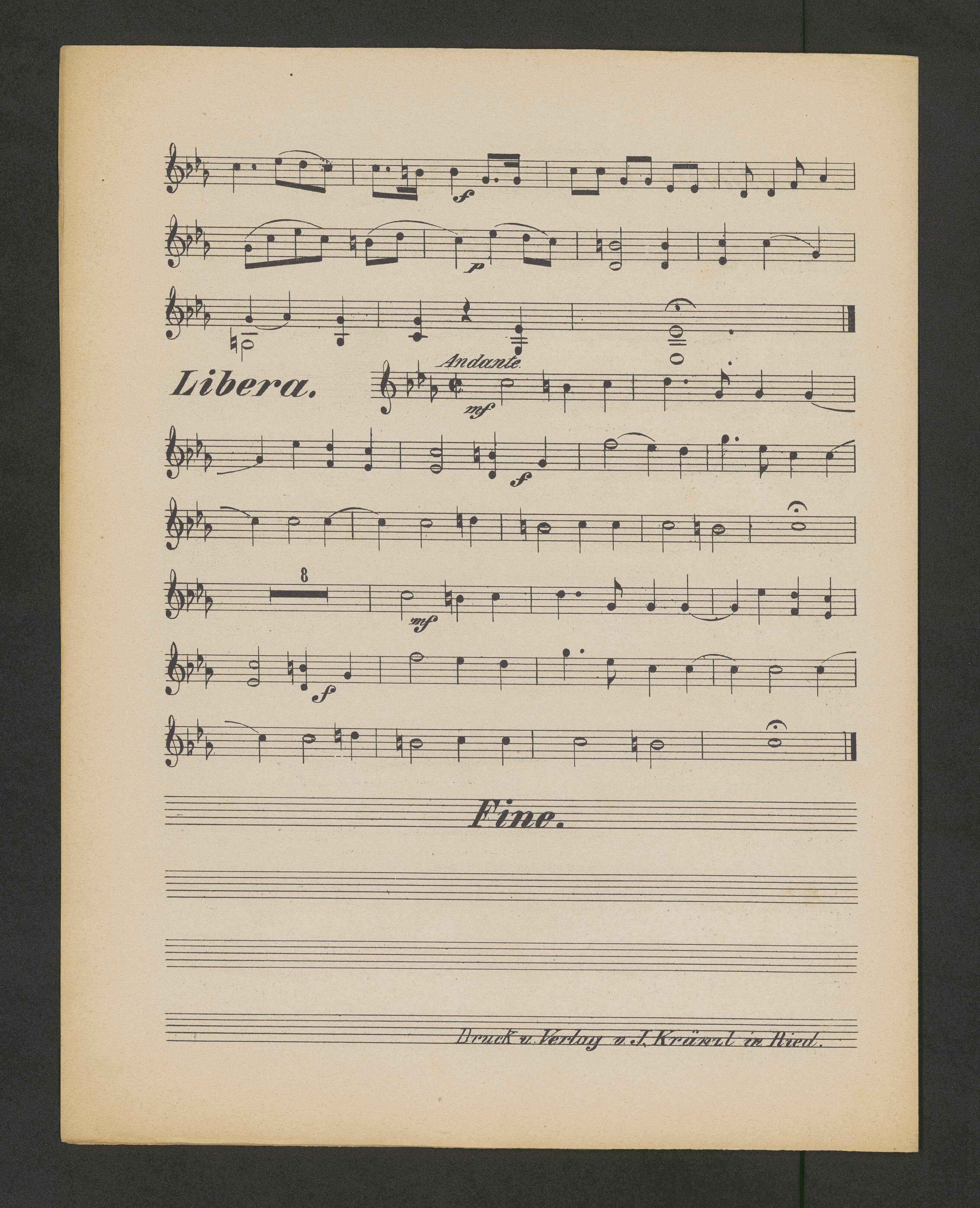 [on the cover:] Kurzes un leichtes | REQUIEM | sammt Libera | für | Sopran, Alt Bass, Violinen und ausgesetze Orgel, | nebst Tenor und Horn ad libitum, | componirt von | Robert Führer | Opus 211 [...] | RIED, Oberösterreich, | Druck und Verlag von Josef Kränzl, [...]