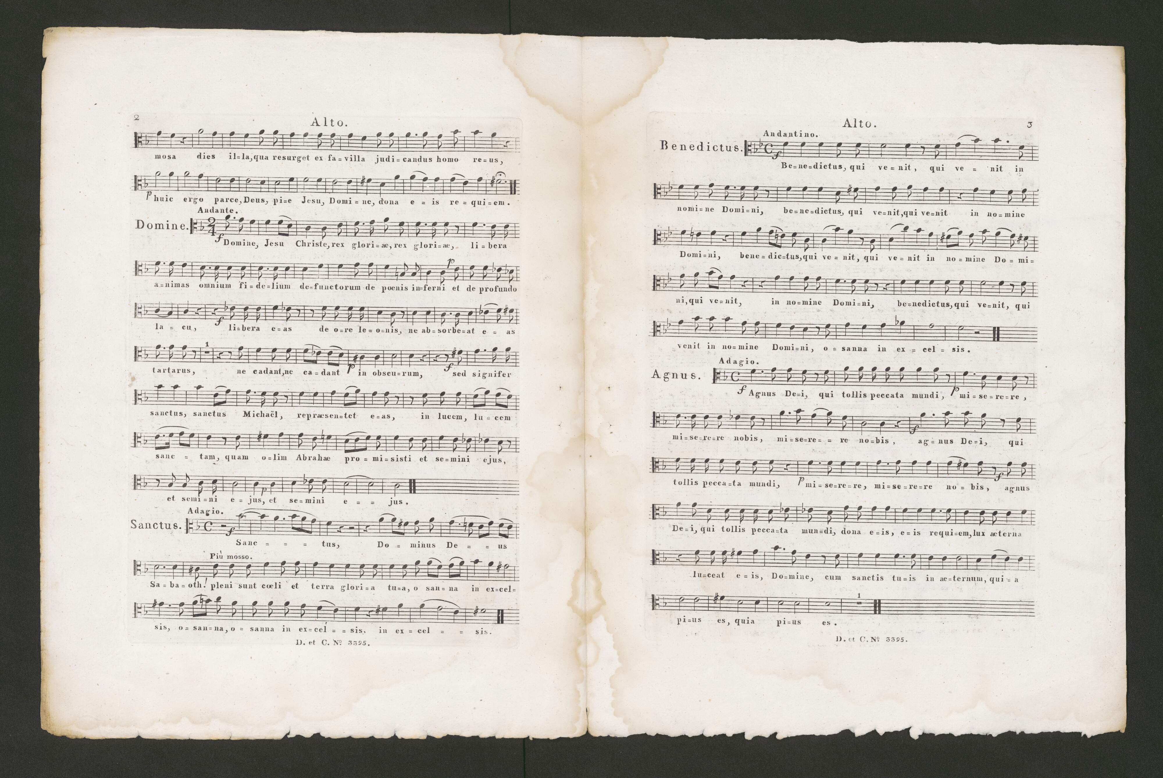 [title page:] REQUIEM | für | Sopran, Alt, Tenor und Bas, | 2 Violinen, 2 Hörner (oder 2 Posaunen), | 2 Trompeten, Violoncell, Contrabass und | Orgel | componirt von | Joh. Gänsbacher, | Kapellmeister an der Metropolitankirche ze S|t| Stephan | 38|tes| Werl. | N|o| 3395. Eigenthum der Verleger. | WIEN, | bei Ant. Diabelli & Comp. | Graben N|o| 1133