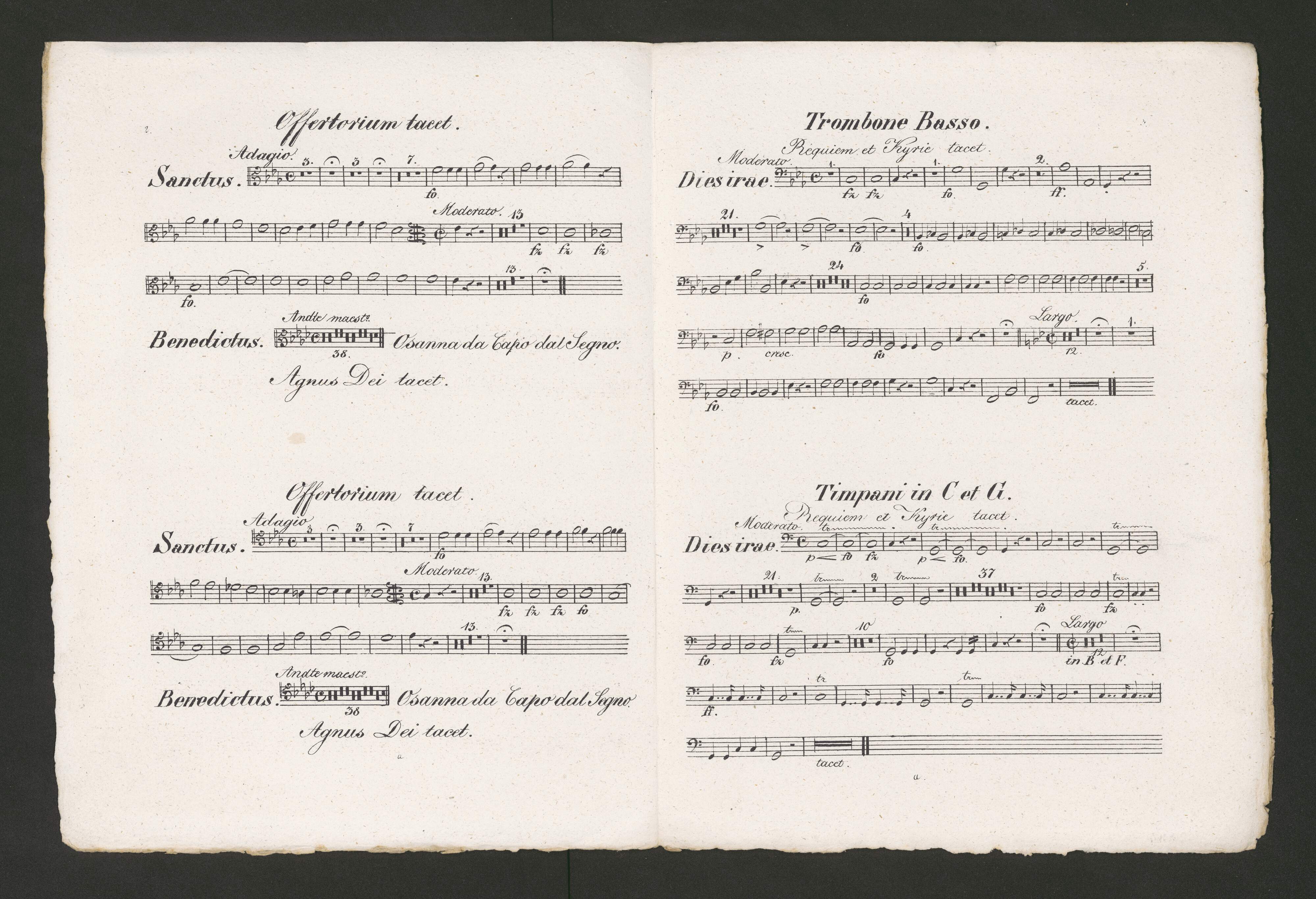 [title page:] Requiem für Sopran, Alt, Tenor und Bass II Violinen, Viola, Orgel und II Hörner oblig. II Trompeten Paucken und III Posaunen ad Lib. von Ioh. Kasp. Aiblinger Königl. Baÿr. Kapellmeister