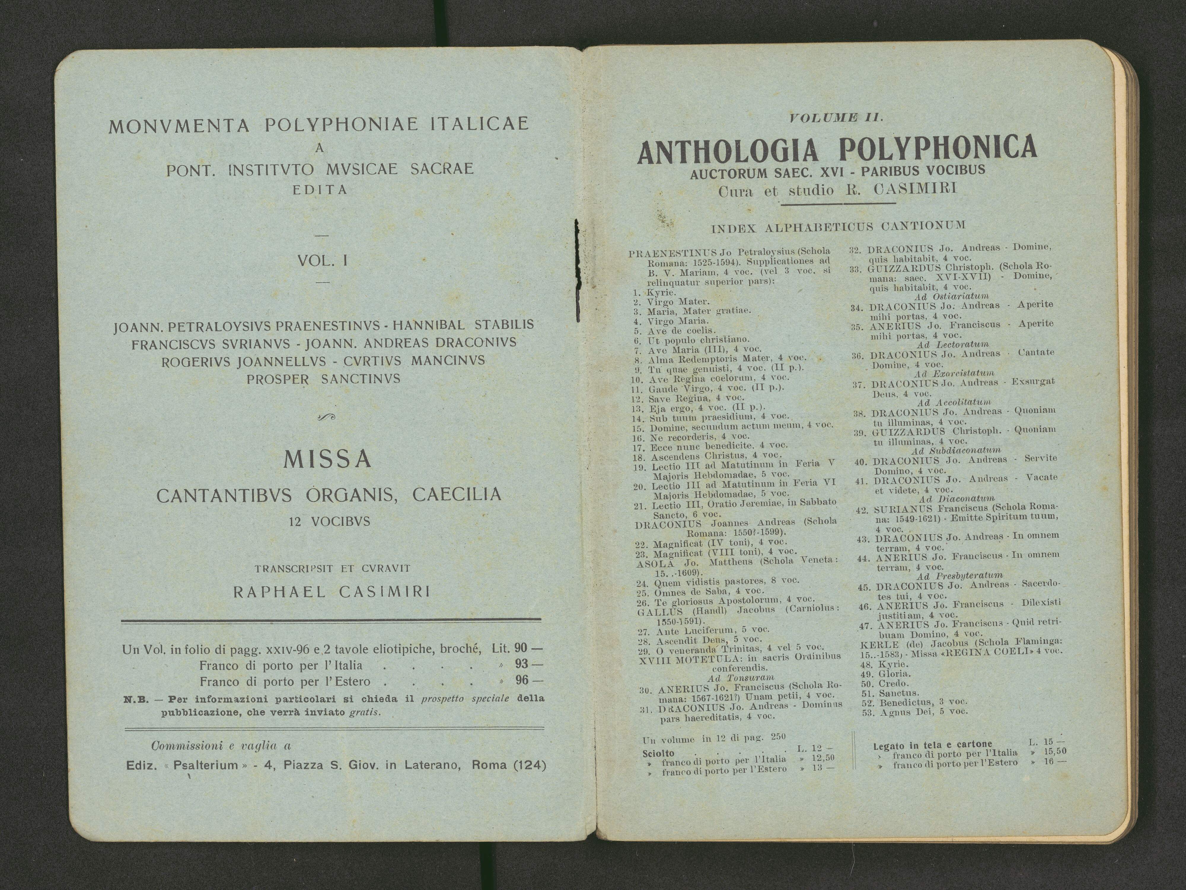 [cover title page:] ANTHOLOGIA POLYPHONICA | AUCTORUM SAECULI XVI | PARIBUS VOCIBUS | CURA ET STUDIO | RAPH. CASIMIRI | Vol. I. | Editio tertia | Edizioni <> | ROMA (124) | 4 - Piazza San Giovanni in Laretano - 4