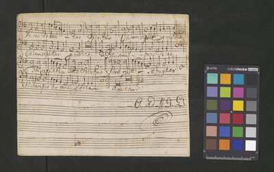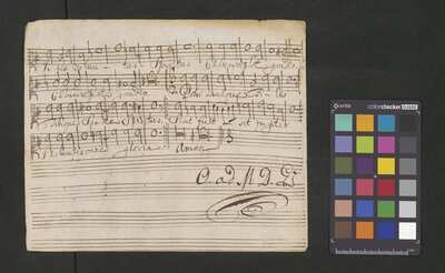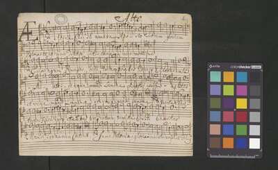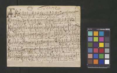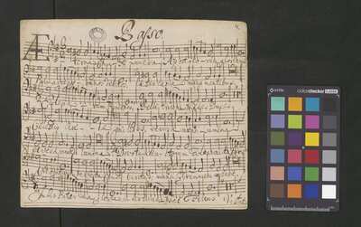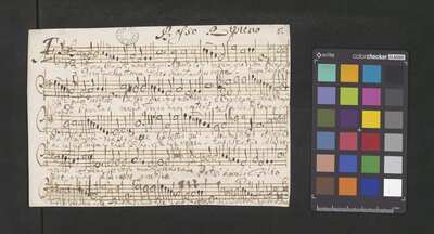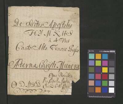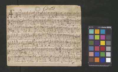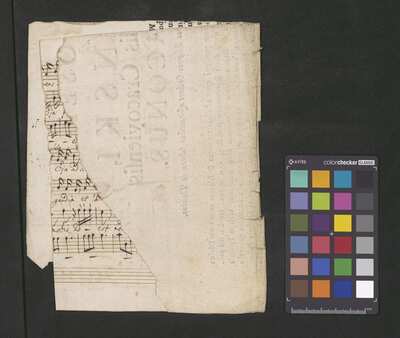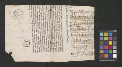 [pl-text: na wewnętrznej stronie obwoluty fragment drukowanego tekstu oraz zapisu obcego utworu], [pl-text: na wewnętrznej stronie obwoluty okrągła pieczęć: „ARCHIWUM I BIBLIOTEKA * Krakowskiej Kapituły Katedralnej”], [pl-text: na kartach 1r, 2r, 3r, 4r, 5r owalna pieczęć: „CATH. CRAC. * ARCH. CAPIT.”], [pl-text: na karcie 5v fragment obcego utworu wokalnego]