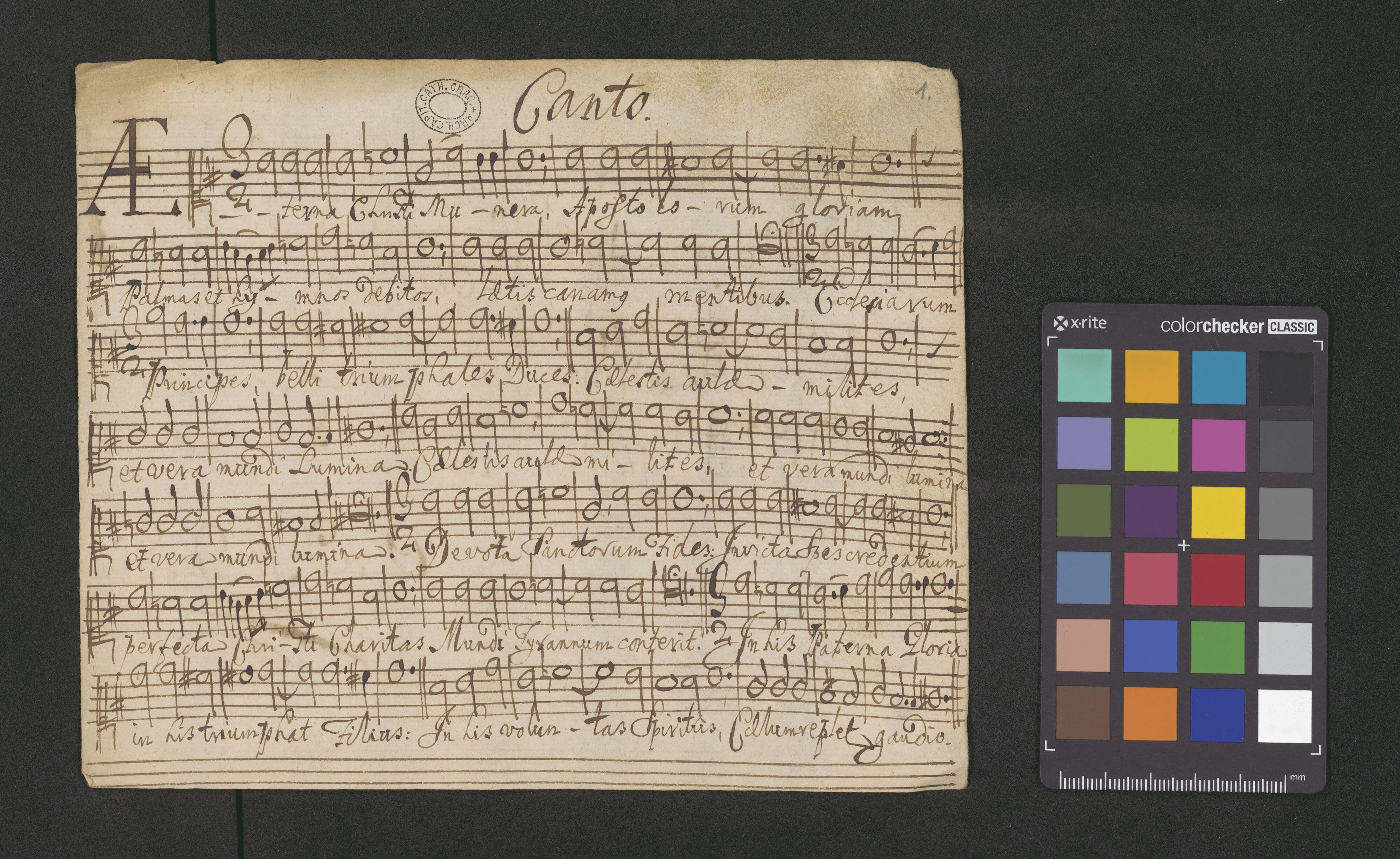 [page title:] De Sstis Apostolis | HYMNUS | à 4 Voci | Canto. Alto. Tenore. Basso. | Aeterna Christi Munera | Opus nobile | Pro Capella Regia | O. ad M. D. Gm. Eccl [?] Cath. Crac