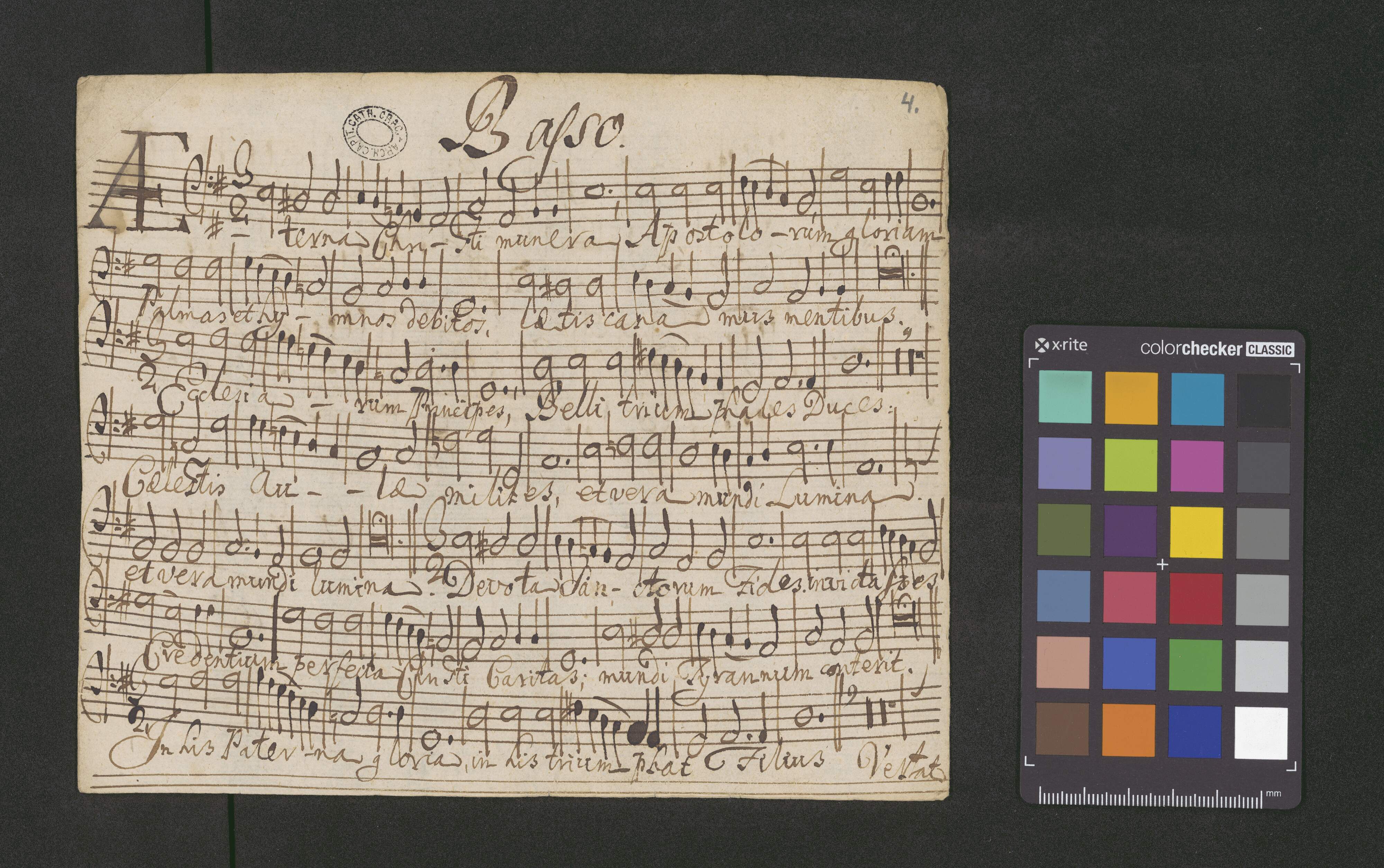 [page title:] De Sstis Apostolis | HYMNUS | à 4 Voci | Canto. Alto. Tenore. Basso. | Aeterna Christi Munera | Opus nobile | Pro Capella Regia | O. ad M. D. Gm. Eccl [?] Cath. Crac