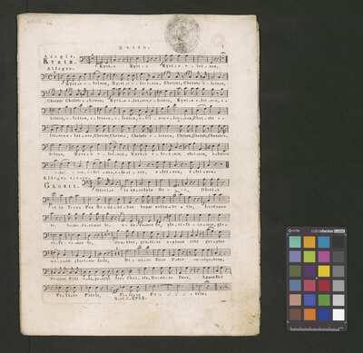 1 score, [pl-text: w źródle kolejność partii: Basso, Violino secondo, Alto, Tenore, Basso, Clarinetto primo in C, Clarinetto secondo in C, Clarino primo in C Clarino secondo in C, Timpani], [pl-text: u góry karty tytułowej adnotacja kredka: "N-i"], [pl-text: na wewnętrznej stronie karty tytułowej okrągła pieczęć: „ARCHIWUM I BIBLIOTEKA * Krakowskiej Kapituły Katedralnej”], [pl-text: na jednej ze stron partii Tenore okrągła, zamazana pieczęć], [pl-text: na jednej ze wstępnych stron adnotacja: "Missa z C."], [pl-text: na wybranych kartach czerwona owalna pieczęć: „CATH. CRAC. * ARCH. CAPIT.”]