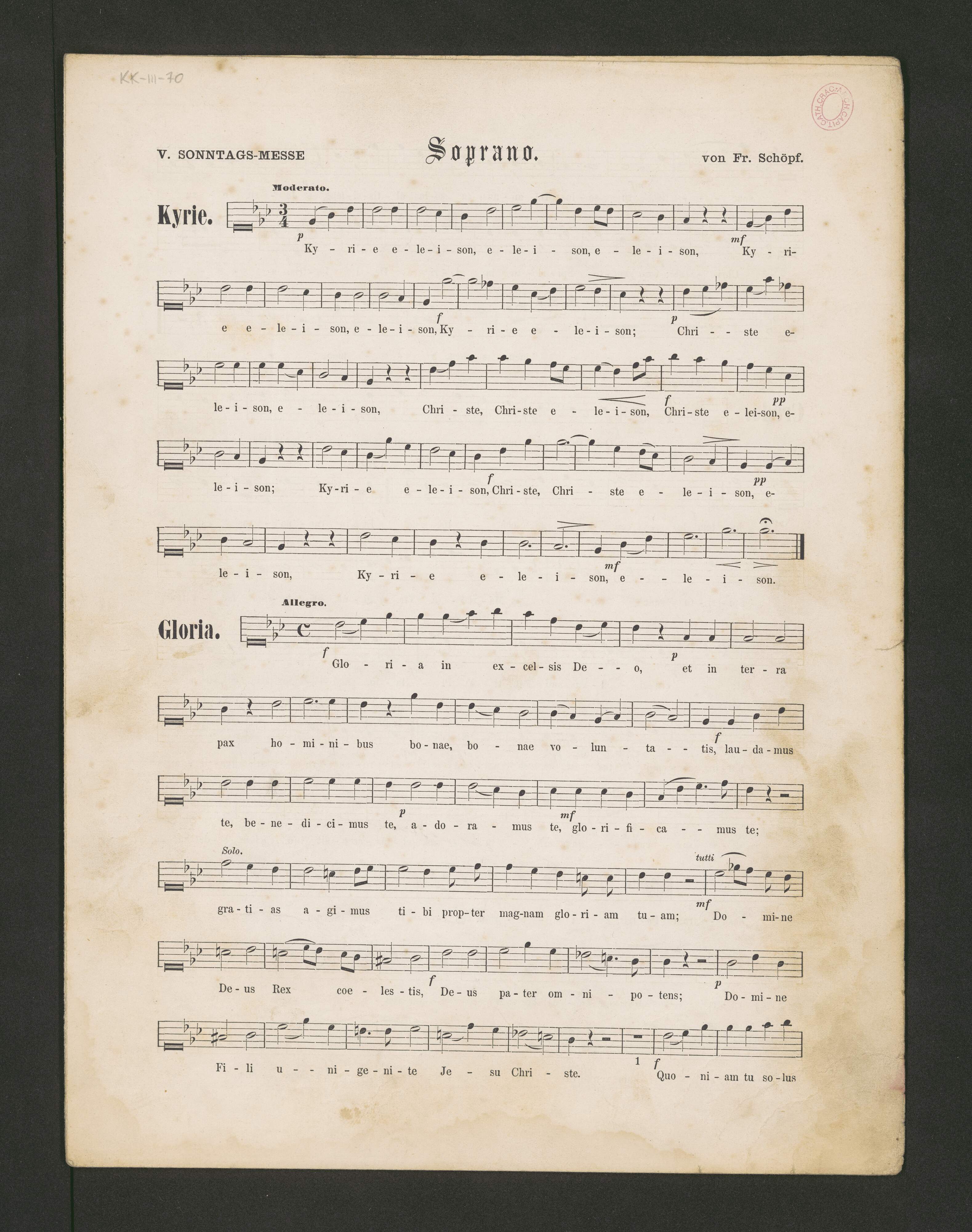fünfte | SONNTAGS-MESSE IN ES | (Fest-Messe für kleinere Landhüre) | für | Sopran, Alt, Tenor, Bass, | zwei Violinen, Viola, Violon, oder Orgel obligat, zwei Clarinetten, zwei | Hörner, zwei Trompeten und Pauken ad libitum; | mit einer | ausgese[?]ten Orgelstimme. | Leicht und kirchlich, | für kleine | oder grössere Land- und Klosterchöre. | Componirt | von | FRANZ SCHÖPF, | Stadtpfarr-Organist in Bozen. | Op. 14. | Eigenthum des Componisten. | [...] Innsbruck. | Commisions-Verlag der Kunst- und Musikalienhandlung von Inh. Gross. | (A. S. Reiss.)
