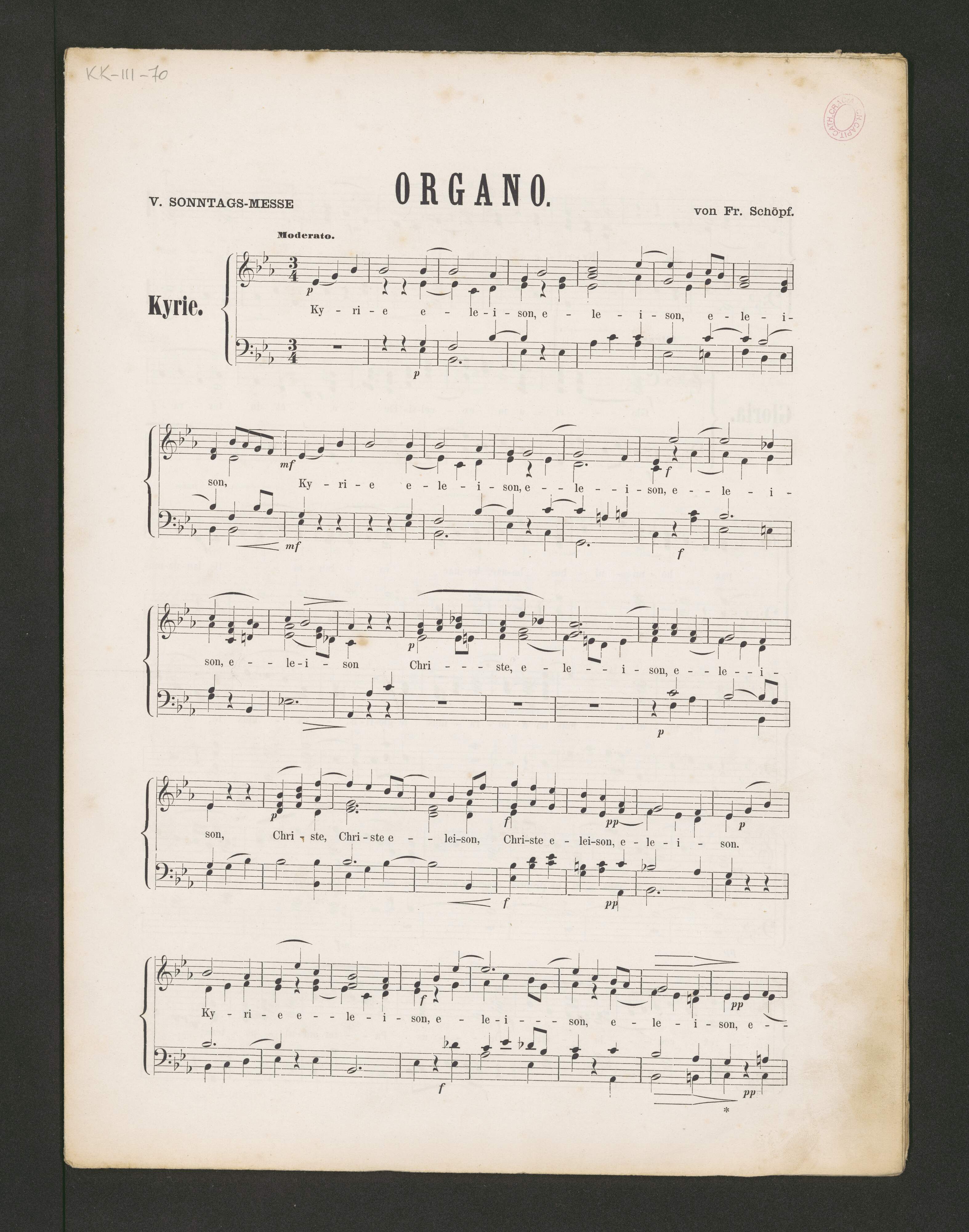 fünfte | SONNTAGS-MESSE IN ES | (Fest-Messe für kleinere Landhüre) | für | Sopran, Alt, Tenor, Bass, | zwei Violinen, Viola, Violon, oder Orgel obligat, zwei Clarinetten, zwei | Hörner, zwei Trompeten und Pauken ad libitum; | mit einer | ausgese[?]ten Orgelstimme. | Leicht und kirchlich, | für kleine | oder grössere Land- und Klosterchöre. | Componirt | von | FRANZ SCHÖPF, | Stadtpfarr-Organist in Bozen. | Op. 14. | Eigenthum des Componisten. | [...] Innsbruck. | Commisions-Verlag der Kunst- und Musikalienhandlung von Inh. Gross. | (A. S. Reiss.)