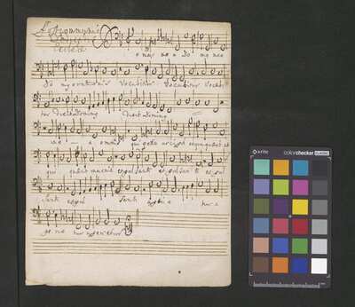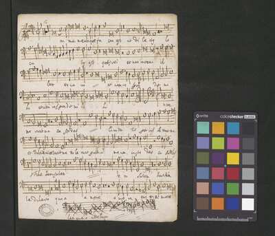2 scores, [pl-text: na wewnętrznej stronie obwoluty okrągła pieczęć: „ARCHIWUM I BIBLIOTEKA * Krakowskiej Kapituły Katedralnej”], [pl-text: na wybranych kartach rękopisu owalna pieczęć: „CATH. CRAC. * ARCH. CAPIT.”]