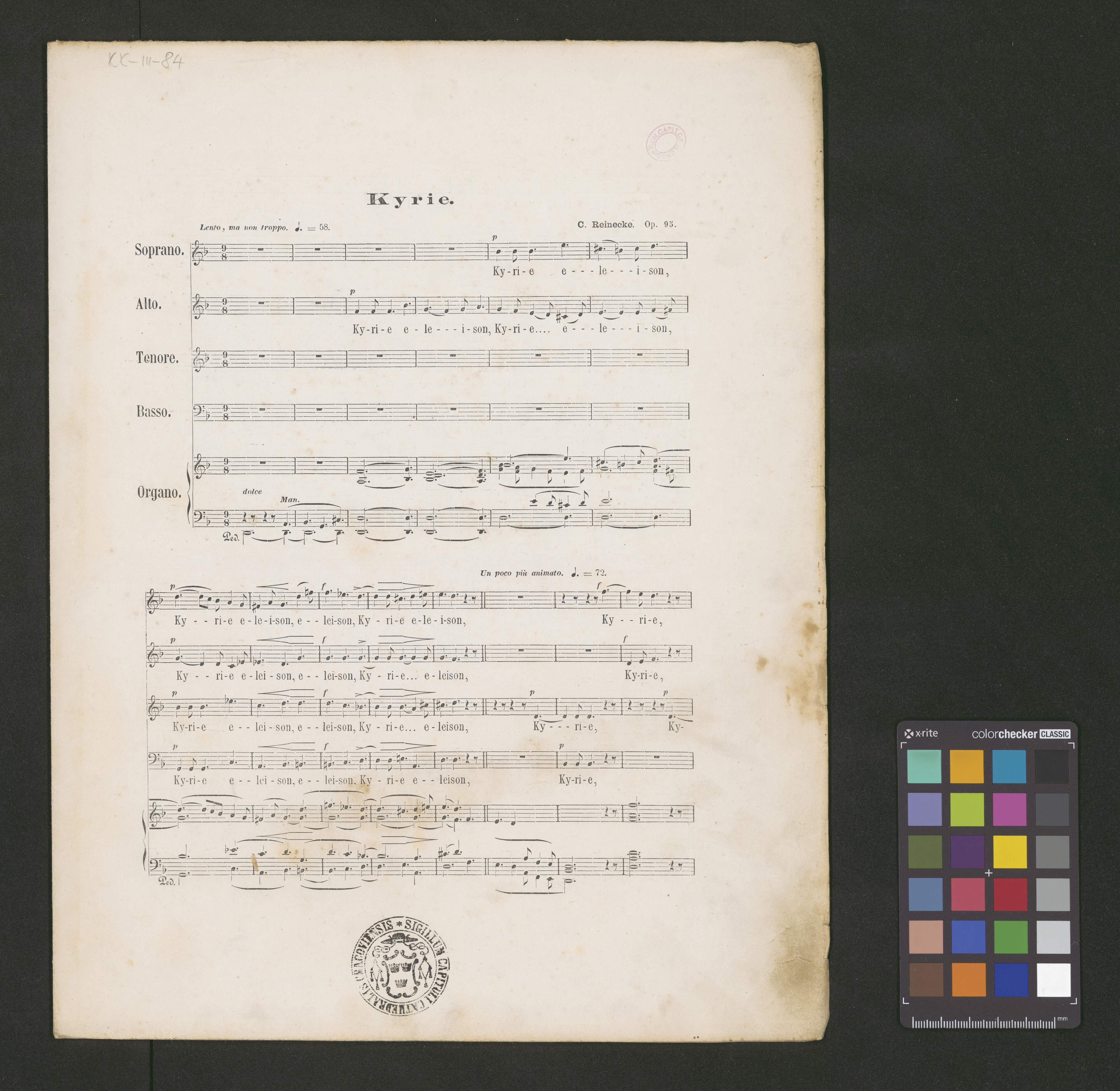 [page title:] MISSA | CUM OFFERTORIO "EXULTA SATIS, FILIA SION" | AD | QUATUOR ET QINQUE VOCES INEQUALES | ET ORGANUM | COMPOSITA | A | CAROLO REINECKE. | Opus XCV. | PARTITIONIS CUM VOCIBUS | Pret. Thlr. 1. 6 Sgr. Fl. 2. - Kr. Fr. 4. 50 Ctm. | SINGULAR. VOC. 4 PAG. | Pret. 3 Sgr. 10 Kr. 35 Ctm. | Einsidlae, Neo-Eboraci et Cincinnati. | TYPIS ET SUMPTIBUS CAROLI ET NICOLAI BENZIGER, FRATRUM, | Ss. Sedis Apostolicae typographi. | 1870. |