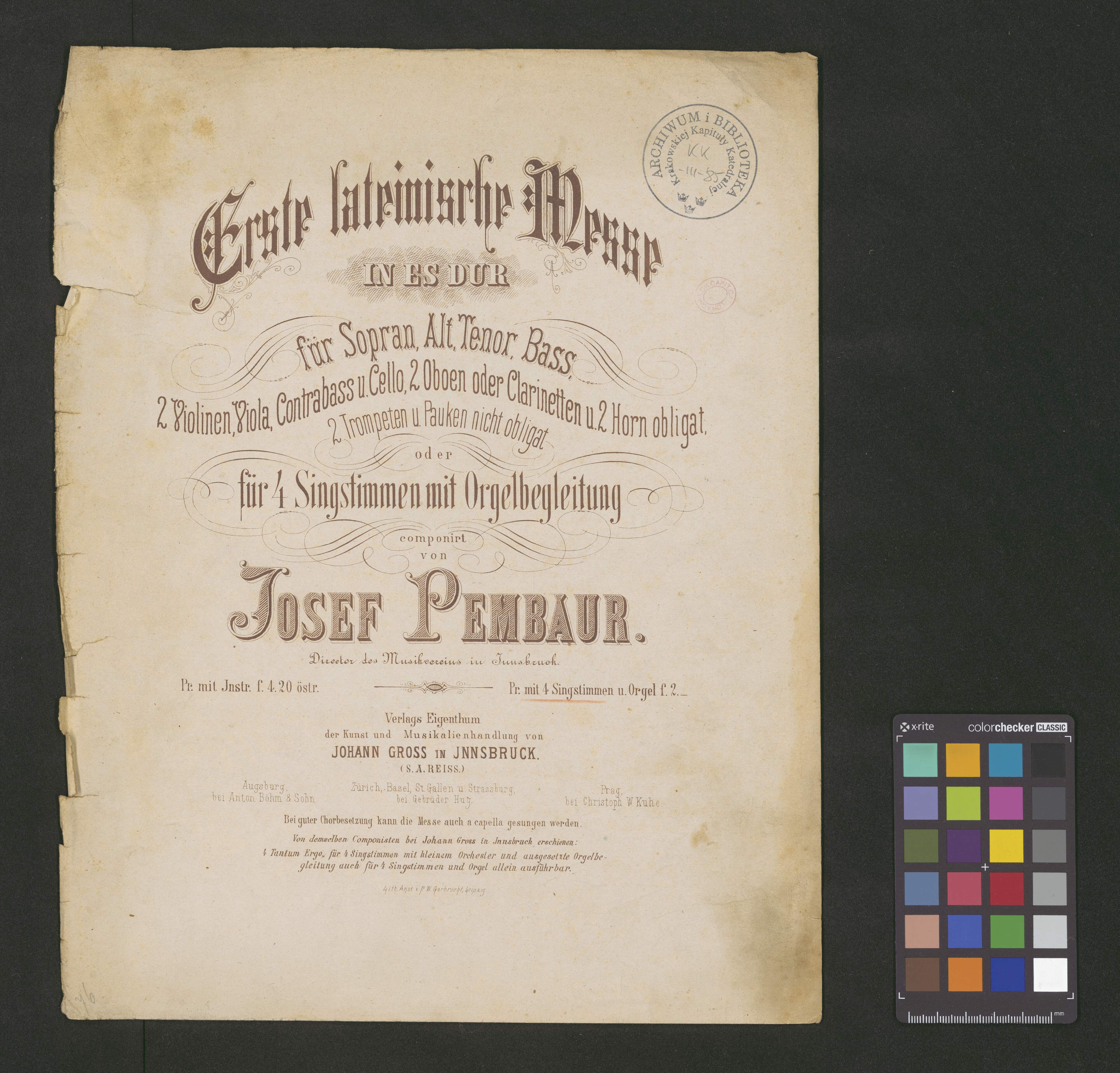 [page title:] Erste lateinsche Messe | IN ES DUR | für Sopran, Alt, Tenor, Bass, | 2 Violinen, Viola, Contrabass u. Cello, 2 Oboen oder Clarinetten u. 2 Horn obligat, 2 Trompeten u. Pauken nicht obligat | oder | für 4 Singstimmen mit Orgelbegleitung | componirt | von | Josef Pembaur. | Director des Musikvereins in Innsbruck. | [...] Verlags Eigenthum | der Kunst und Musikhandlung von | JOHANN GROSS IN INNSBRUCK. | (S. A. REISS.) |
