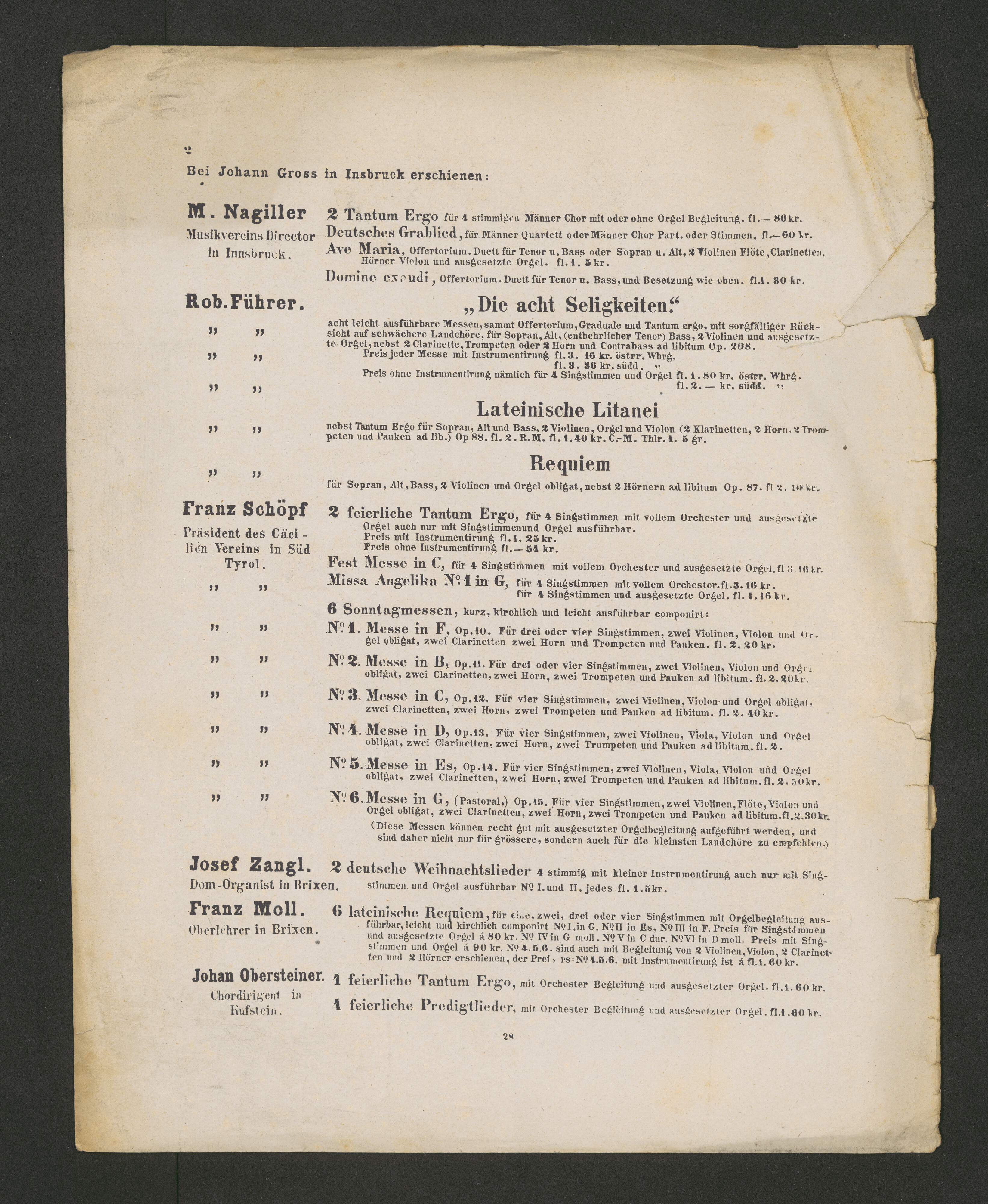 [page title:] Erste lateinsche Messe | IN ES DUR | für Sopran, Alt, Tenor, Bass, | 2 Violinen, Viola, Contrabass u. Cello, 2 Oboen oder Clarinetten u. 2 Horn obligat, 2 Trompeten u. Pauken nicht obligat | oder | für 4 Singstimmen mit Orgelbegleitung | componirt | von | Josef Pembaur. | Director des Musikvereins in Innsbruck. | [...] Verlags Eigenthum | der Kunst und Musikhandlung von | JOHANN GROSS IN INNSBRUCK. | (S. A. REISS.) |