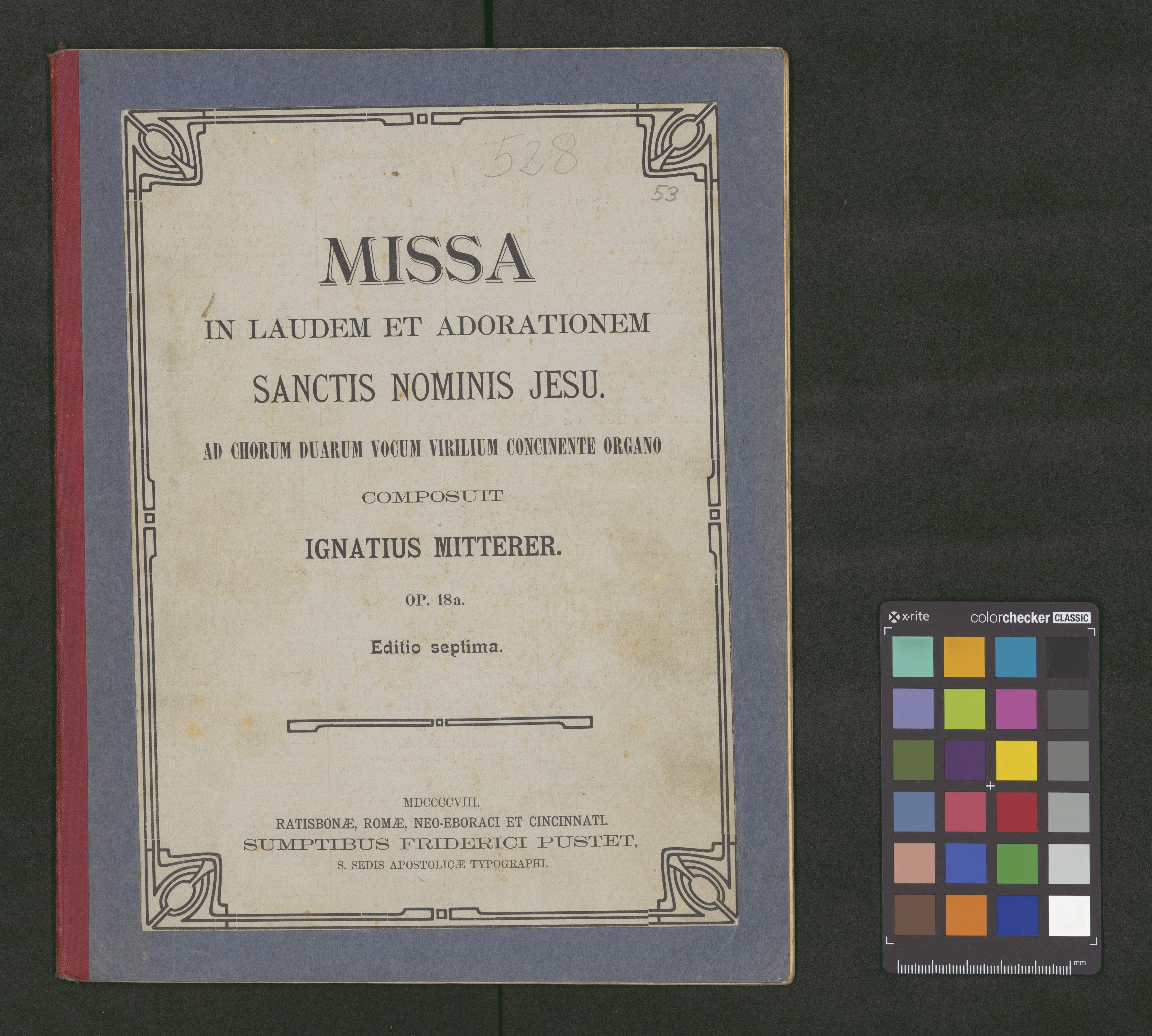 [cover title, score:] MISSA | IN LAUDEM ET ADORATIONEM | SANCTIS NOMINIS JESU. | AD CHORUM DUARUM VOCUM VIRILUM CONCINENTE ORGANO | COMPOSUIT | IGNATIUS MITTERER. | OP. 18a. | Editio septima. | MDCCCCVIII. | RATISBONÆ, ROMÆ, NEO-EBORACI ET CINCINNATI. | SUMPTIBUS FRIDERICI PUSTET, | S. SEDIS APOSTOLICÆ TYPOGRAPHI
