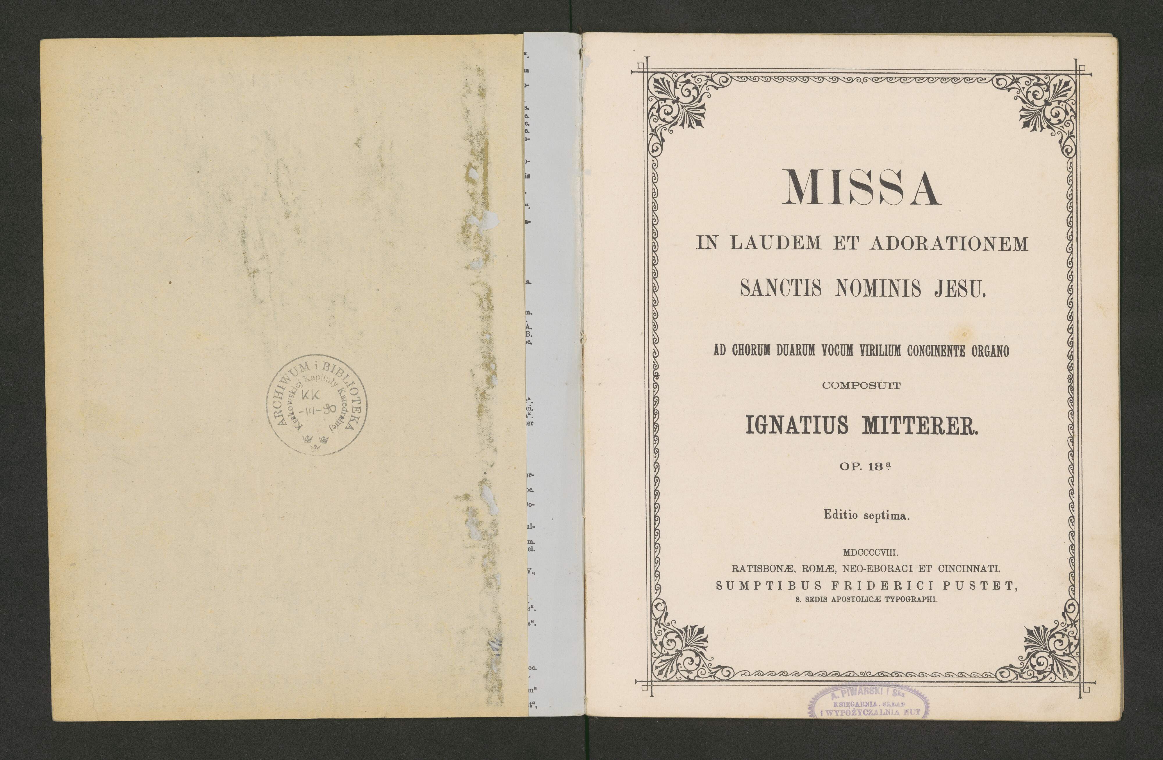 [cover title, score:] MISSA | IN LAUDEM ET ADORATIONEM | SANCTIS NOMINIS JESU. | AD CHORUM DUARUM VOCUM VIRILUM CONCINENTE ORGANO | COMPOSUIT | IGNATIUS MITTERER. | OP. 18a. | Editio septima. | MDCCCCVIII. | RATISBONÆ, ROMÆ, NEO-EBORACI ET CINCINNATI. | SUMPTIBUS FRIDERICI PUSTET, | S. SEDIS APOSTOLICÆ TYPOGRAPHI