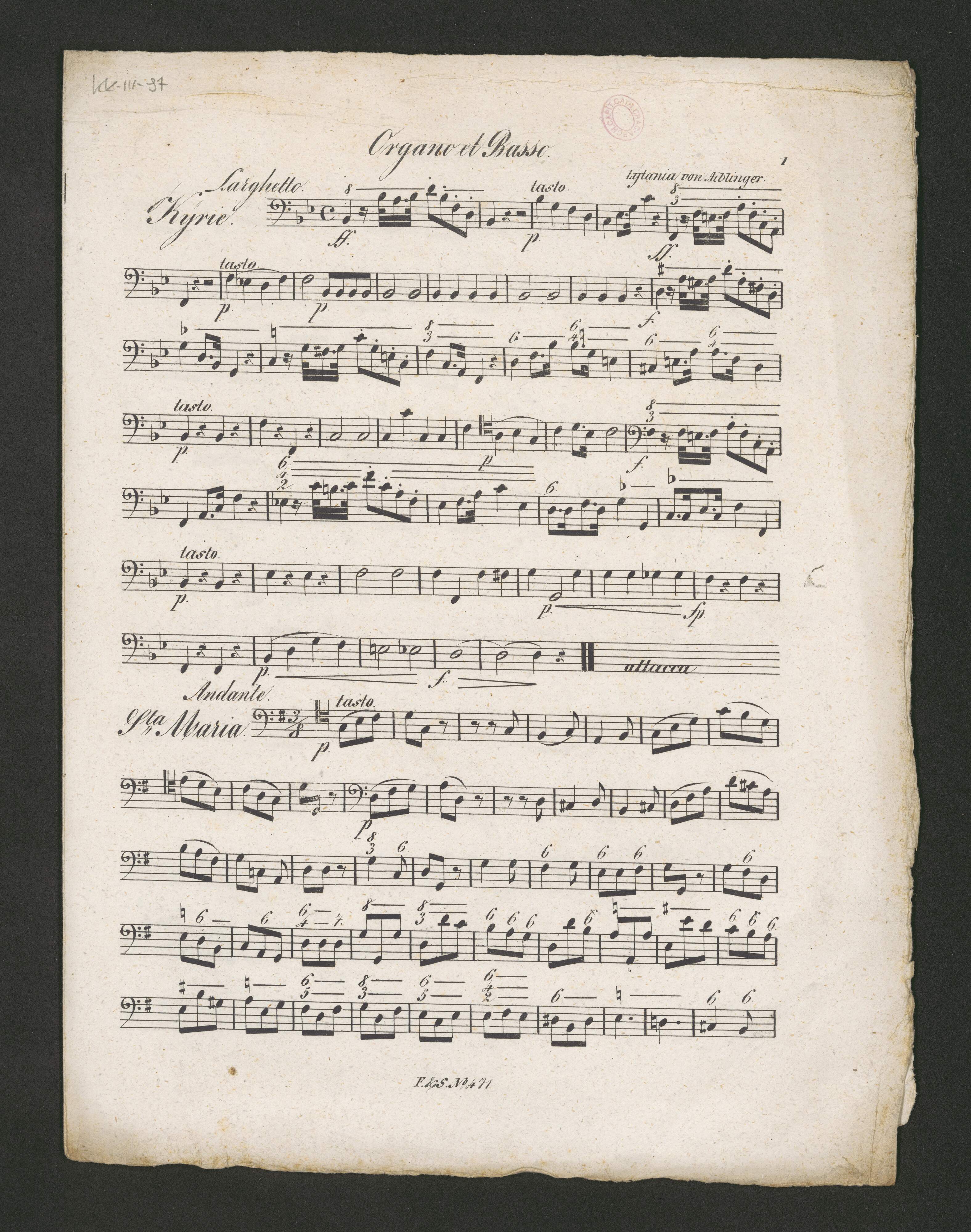 LYTANEY | in B | für | Vier Singstimmen, 2 Violinen, Viola, Orgel und | 2 Hörnen obligat, Trompeten & Pauken | ad libitum | von | JOH. CAS. AIBLINGER | K: b. Kapellmeister. | [right:] Pr. ft2, 30 kr | [center:] EIGENTHUM DER VERLIEGER | Eingetragen in dem Vereins-Archive | Munchen in der K. b. Hof-Musikalien und Musik-Instrumenten-Handlung | von Falter & Sohn | N|o 471