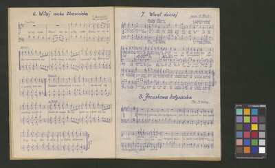 [pl-text: Odbotki hektograficzne.], [pl-text: Odbitki hektograficzne.], [pl-text: Na II s. okł. pieczęć okrągła z herbem Trzy korony, w otoku treść: "ARCHIWUM i BIBLIOTEKA | Krakowskiej Kapituły Katedralnej".], [pl-text: Na s. 3 owalna pieczęć: „CATH. CRAC. * ARCH. CAPIT.”], [pl-text: Na okładce, ołówkiem: "dyrygent".], [pl-text: Na II s. okł. pieczęć okrągła z herbem Trzy korony, w otoku treść: "ARCHIWUM i BIBLIOTEKA | Krakowskiej Kapituły Katedralnej".], [pl-text: pomiędzy s. 2-3 włożone puste podwójne folio innego papieru.], [pl-text: Skreślenia i poprawki ołówkiem.], [pl-text: Na s. 3 owalna pieczęć: „CATH. CRAC. * ARCH. CAPIT.”], [pl-text: Brak części karty ze stronami 7-8.], [pl-text: Na II s. okł. pieczęć okrągła z herbem Trzy korony, w otoku treść: "ARCHIWUM i BIBLIOTEKA | Krakowskiej Kapituły Katedralnej".], [pl-text: Na s. 3 owalna pieczęć: „CATH. CRAC. * ARCH. CAPIT.”], [pl-text: Do druku dołączone rękopiśmienne partesy jednego z utworów z kolekcji ("Trzej królowie jadą").], [pl-text: Na II s. okł. pieczęć okrągła z herbem Trzy korony, w otoku treść: "ARCHIWUM i BIBLIOTEKA | Krakowskiej Kapituły Katedralnej".], [pl-text: Na s. owalna pieczęć: „CATH. CRAC. * ARCH. CAPIT.”], [pl-text: Na II s. okł. pieczęć okrągła z herbem Trzy korony, w otoku treść: "ARCHIWUM i BIBLIOTEKA | Krakowskiej Kapituły Katedralnej".], [pl-text: Na s. 5 owalna pieczęć: „CATH. CRAC. * ARCH. CAPIT.”]