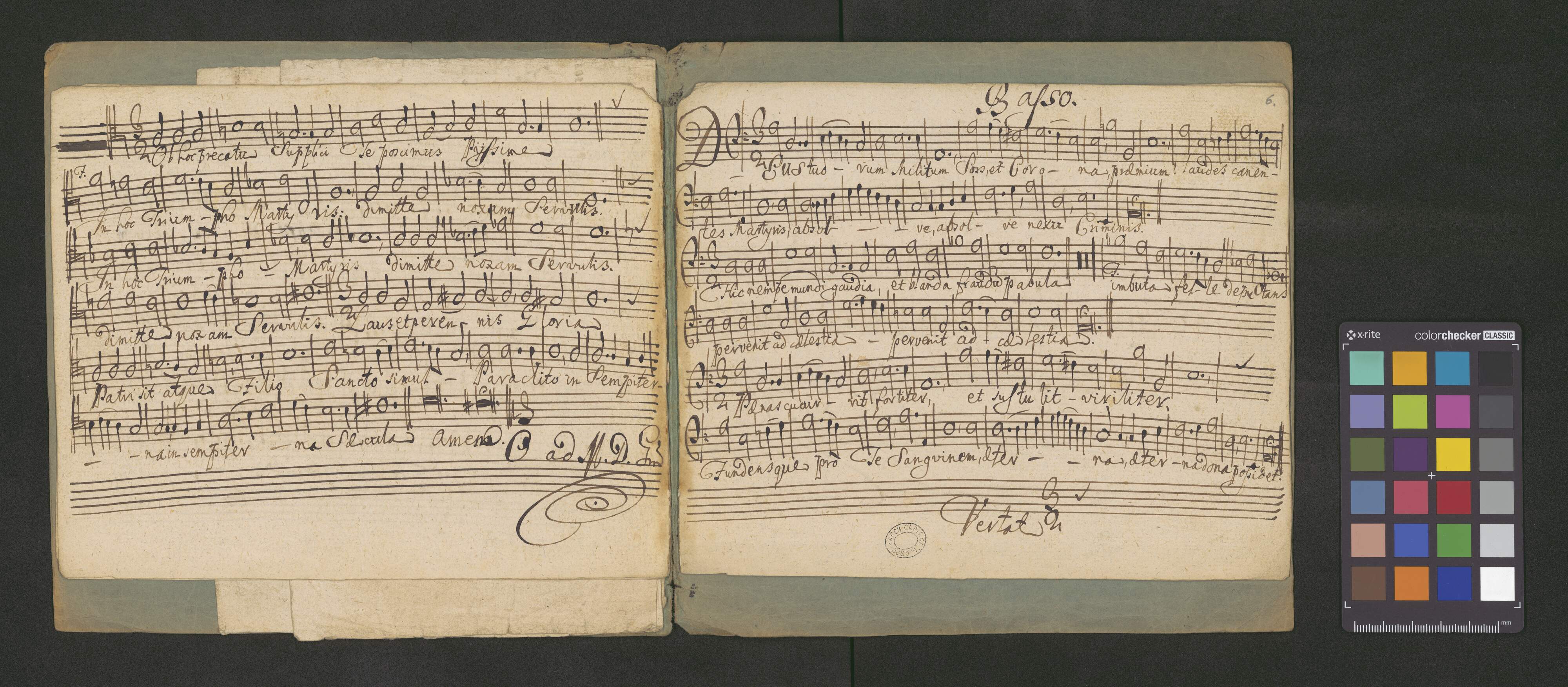 [on the title page :] Pro Uno Martyre | HYMNUS |a 4 Voci Pari | Canto. Alto. Tenore Basso | DEUS Tuorum Militium | Opus Nobile | [on the left side:] O ad M. D. Gm [on the right side:] Pro Eccla Cathedrali | Crac. ad Capella Regia