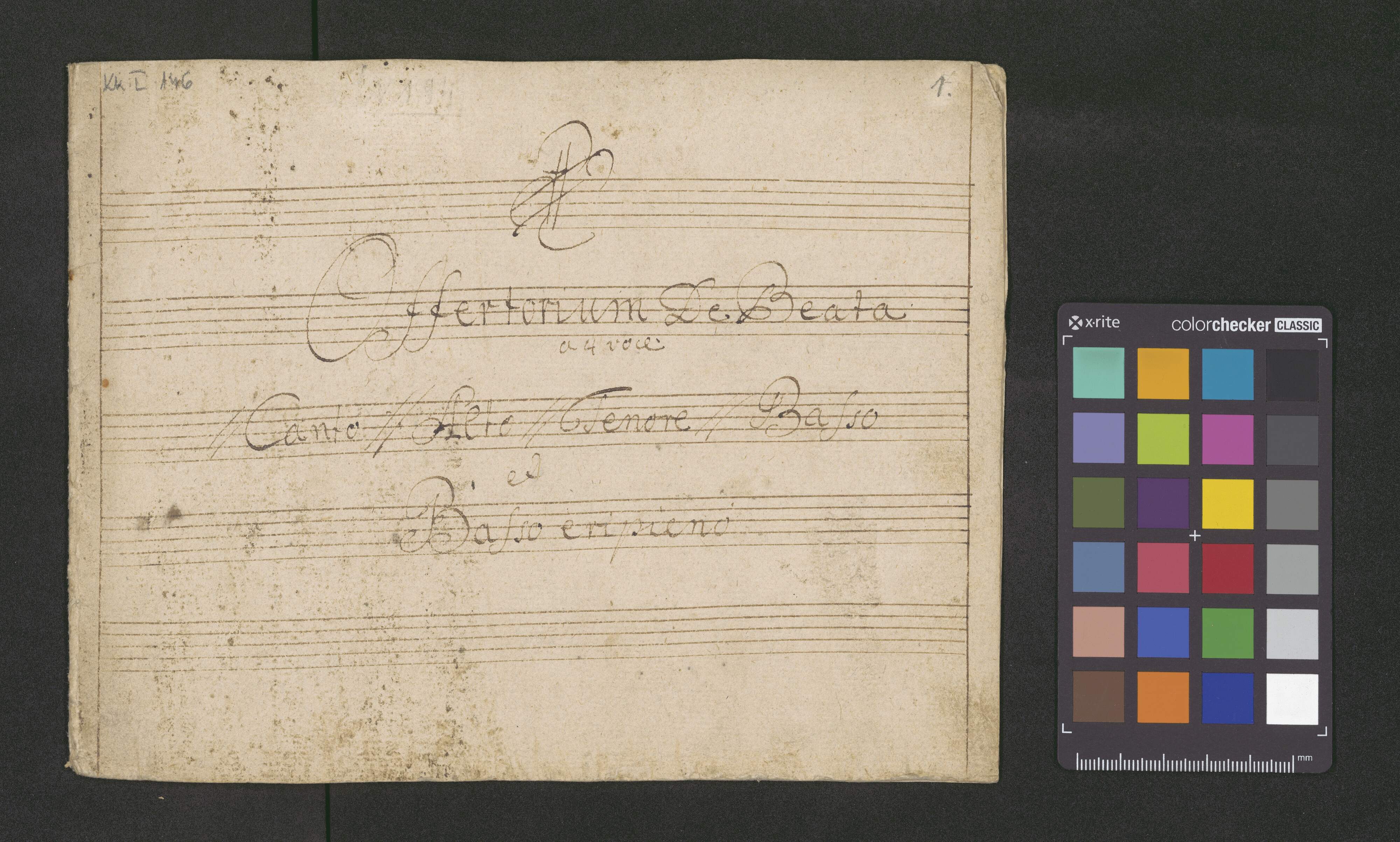 [on the tutle page:] Offertorium De Beata | a 4 voce | Canto Alto Tenore Basso | et | Basso ripieno