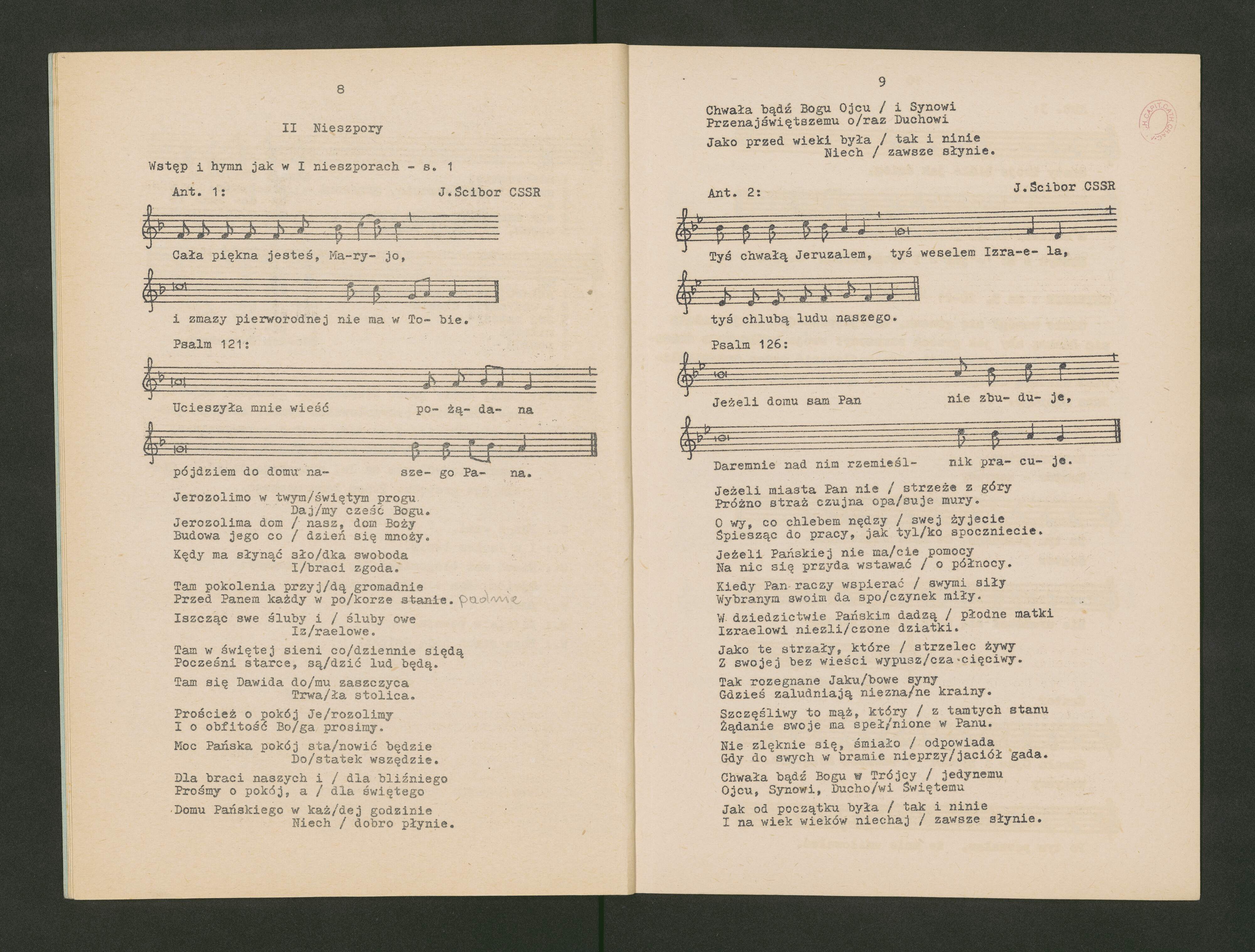 [caption title on p. 1:] UROCZYSTOŚĆ NIEPOKALANEGO POCZĘCIA | NAJŚWIĘTSZEJ MARYI PANNY | I Nieszpory | wg "Liturgia Horarum" t. I [caption title on p. 8:] Nieszpory II