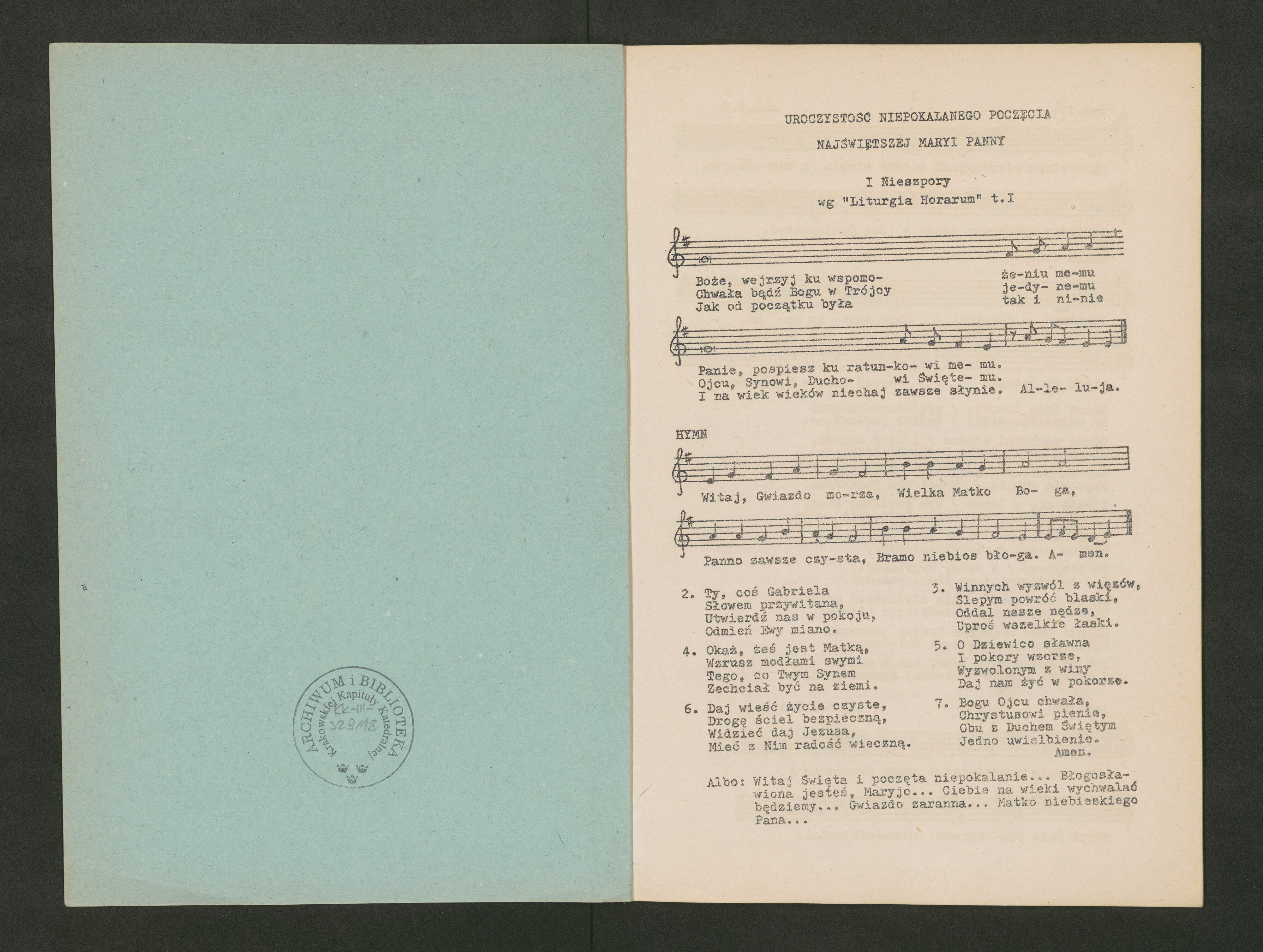 [caption title on p. 1:] UROCZYSTOŚĆ NIEPOKALANEGO POCZĘCIA | NAJŚWIĘTSZEJ MARYI PANNY | I Nieszpory | wg "Liturgia Horarum" t. I [caption title on p. 8:] Nieszpory II