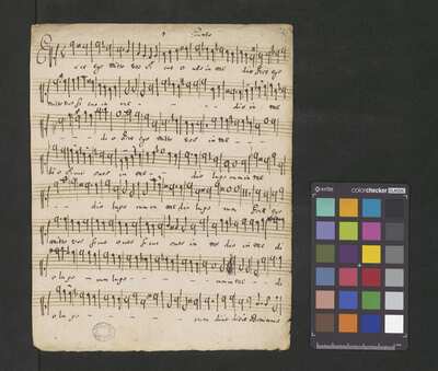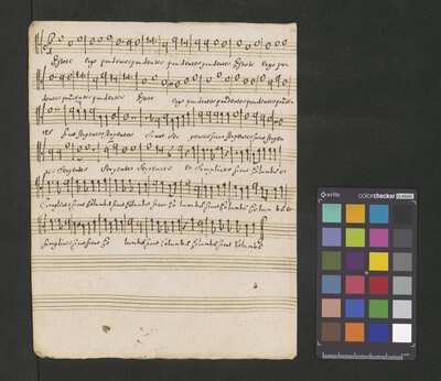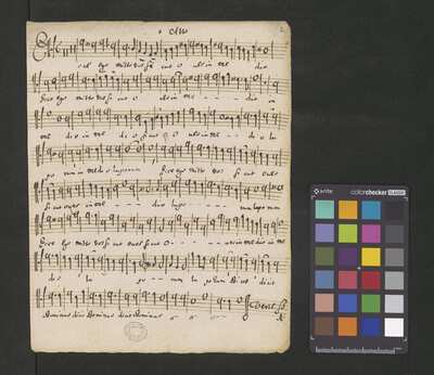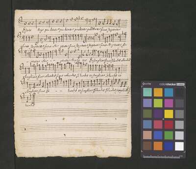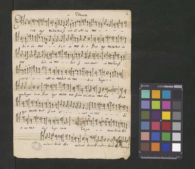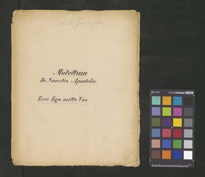 [pl-text: Karty obłożone dodaną później okładką.], [pl-text: Pieczęć: „ARCHIWUM I BIBLIOTEKA”, „Krakowskiej Kapituły Katedralnej” z zapisana ołówkiem sygnaturą na drugiej stronie okładki. Pieczęć: „CATH. CRAC. * ARCH. CAPIT.” umieszczona na każdej karcie.], [pl-text: Foliacja w źródle naniesiona ołówkiem.], [pl-text: Na f.1r w lewym górnym rogu ślad po napisie "Ch. 63".], [pl-text: Na karcie tytułowej, powyżej atramentowego zapisu tytułu utworu, niebieskim ołówkiem napis "może Gorczycki".], [pl-text: Podwójny zapis partii S oraz B.]
