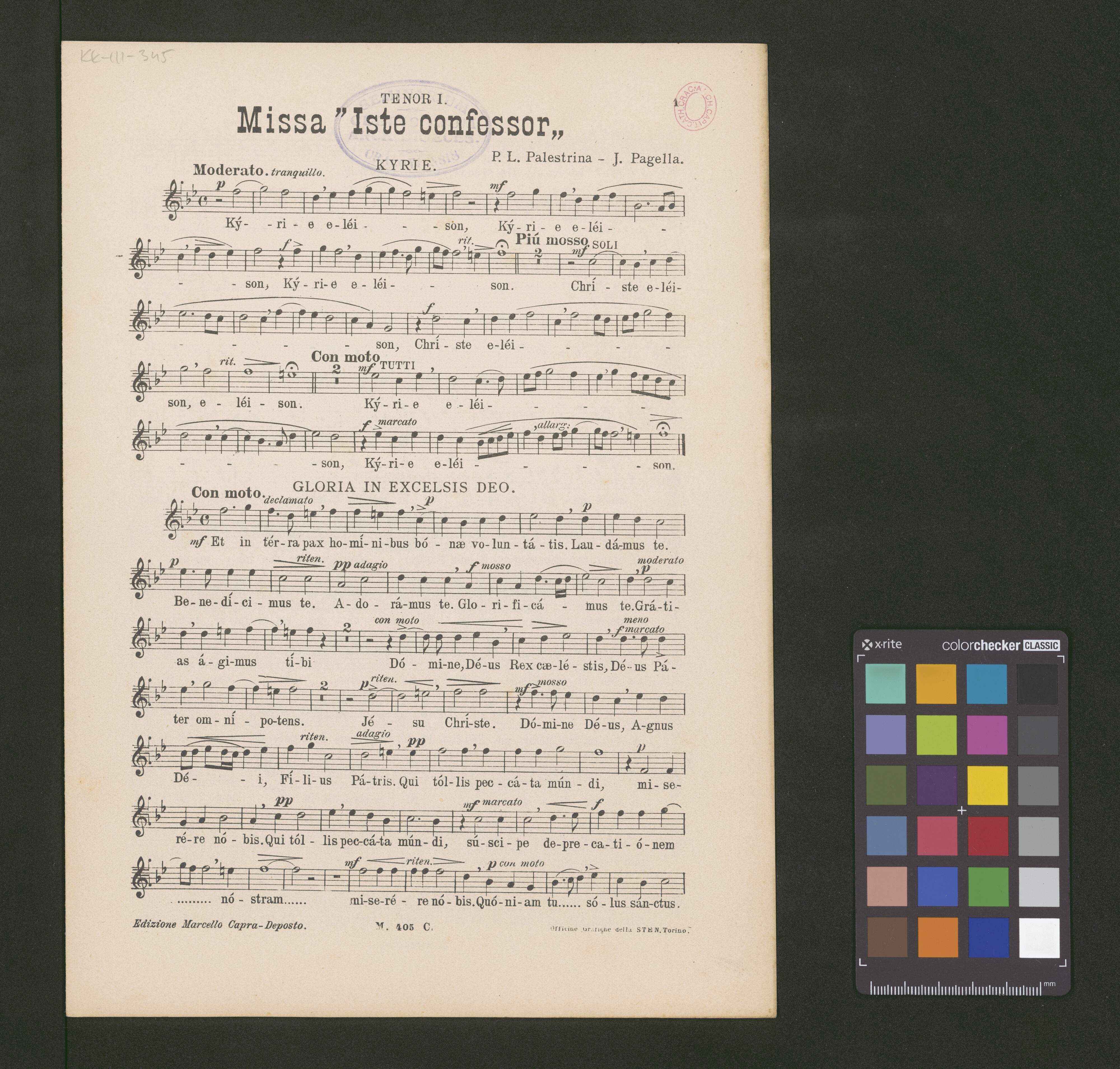 [on the title page:] Edizione Marcello Capra | N. 405. | JOANNES PETRALOYSIUS PRAENESTINUS | (Giovanni Pierluigi da Palestrina). | MISSA | Iste Confessor | quam ad chorum quator vocum virilium | (T. I. et T. II., B. I. et B. II.) | reduxit Presb. J. PAGELLA. | [...] | S. T. E. N. | SOCIETÀ TIPOGRAFICO-EDITRICE NAZIONALE | TORINO | BERLIN-BRUXELLES-LEIPZIG-LONDON-NEW YORK | Breitkopf & Härtel | Per la Repubblica Argentina: | Colegio Pio IX de Artes y Oficios BUENOS-AIRES [space] Per la Repubblica Messicana: | OTTO Y ARZOZ | MEXICO