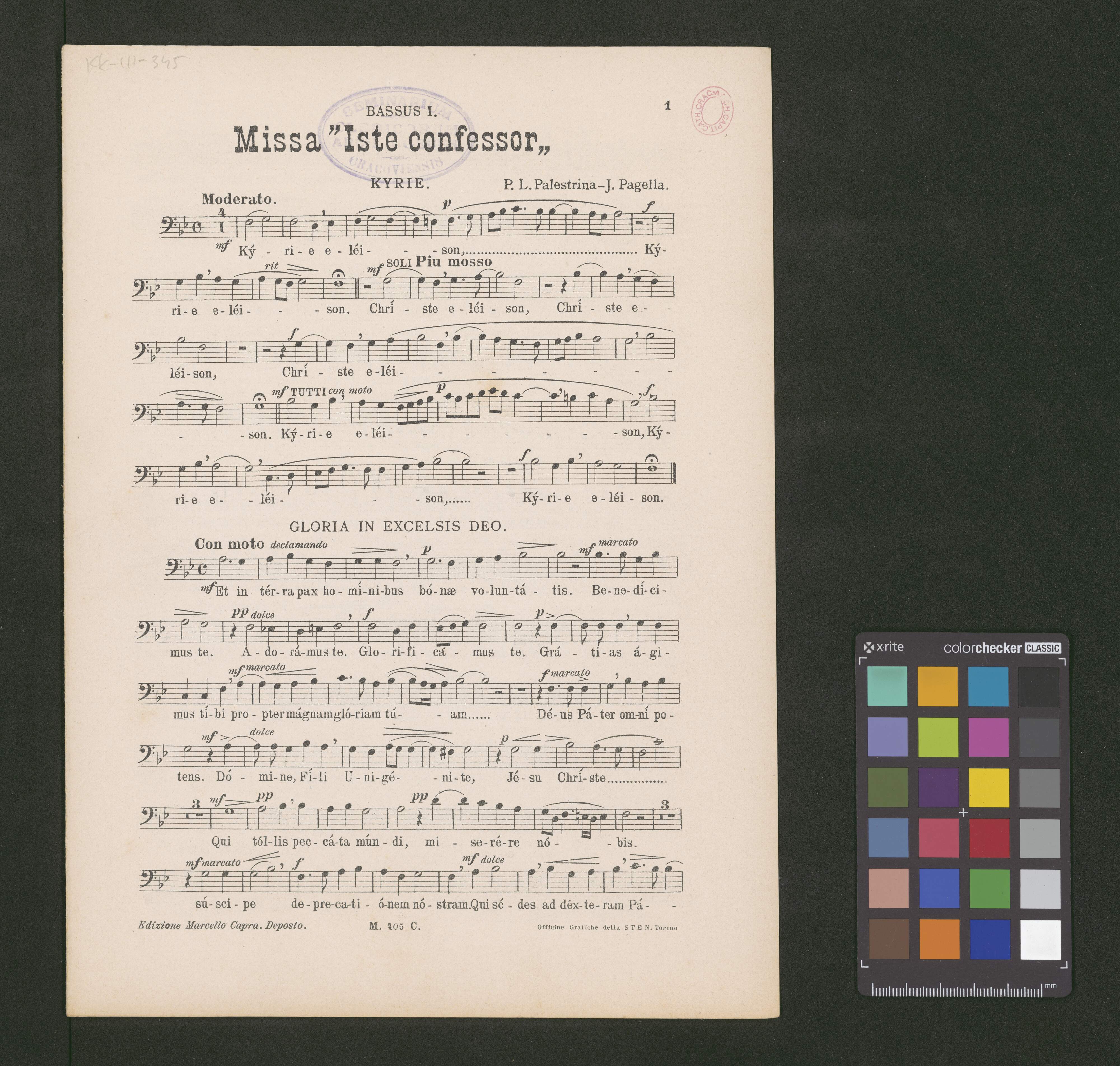 [on the title page:] Edizione Marcello Capra | N. 405. | JOANNES PETRALOYSIUS PRAENESTINUS | (Giovanni Pierluigi da Palestrina). | MISSA | Iste Confessor | quam ad chorum quator vocum virilium | (T. I. et T. II., B. I. et B. II.) | reduxit Presb. J. PAGELLA. | [...] | S. T. E. N. | SOCIETÀ TIPOGRAFICO-EDITRICE NAZIONALE | TORINO | BERLIN-BRUXELLES-LEIPZIG-LONDON-NEW YORK | Breitkopf & Härtel | Per la Repubblica Argentina: | Colegio Pio IX de Artes y Oficios BUENOS-AIRES [space] Per la Repubblica Messicana: | OTTO Y ARZOZ | MEXICO