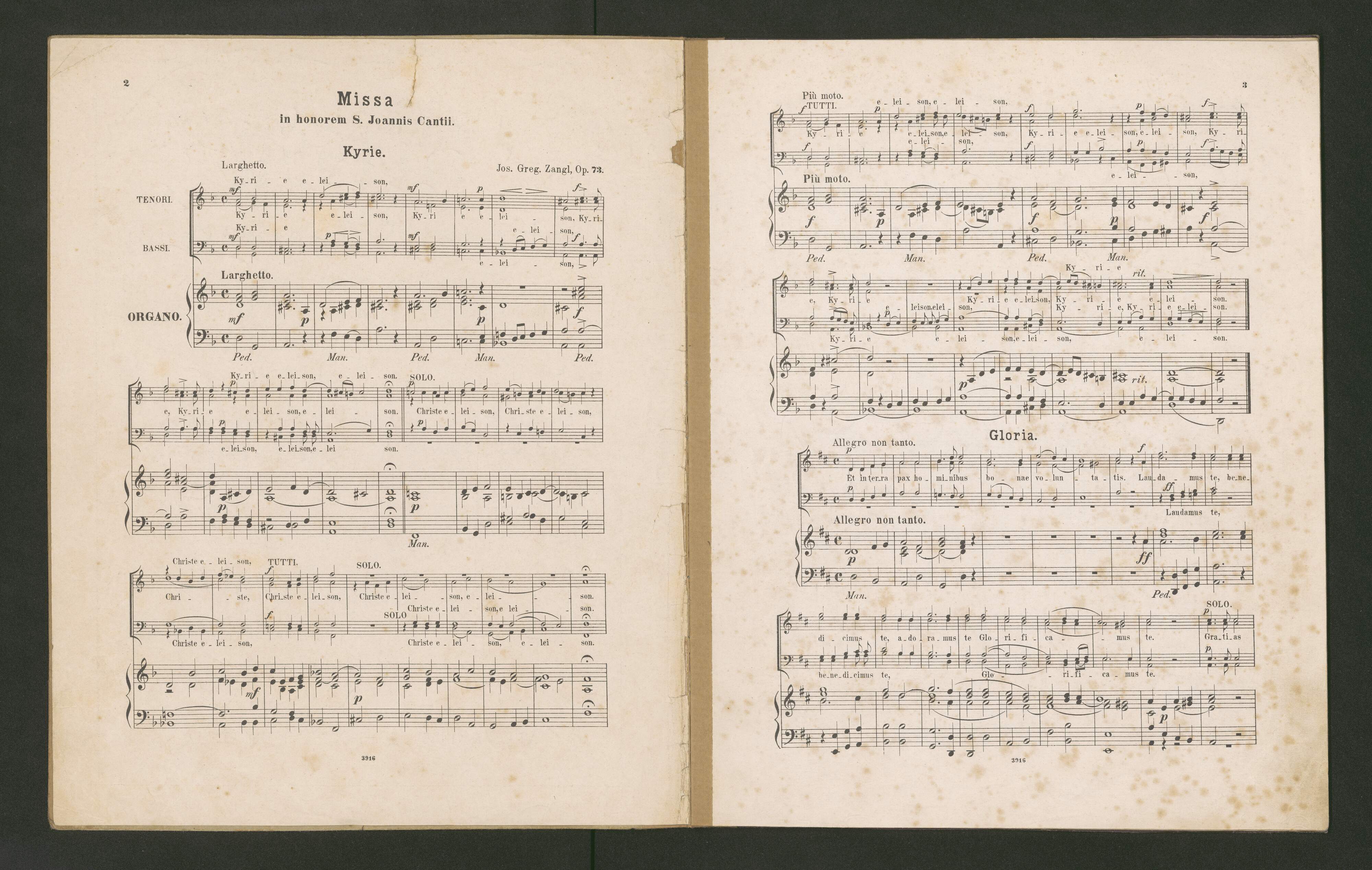 [cover page:] Missa | in honorem S. Joannis Cantii | ad quator voces aequales | comitante Organo non obligato | composita | et | Celsissimo at Reverendissimo Domino Domino | SIMONI AICHNER | Episcopo Brixinensi et Principi | S. Theologiae Doctori, suae Sanct. Praelato domest. etc. etc. | dedicata | a | Jos. Greg. Zangl. | opus 73. [...]| } EDITIO QUARTA. | Propritas Editors | AUGUSTAE VINDEL. SUMTIBUS A . BOEHM ET FILII. | [...]