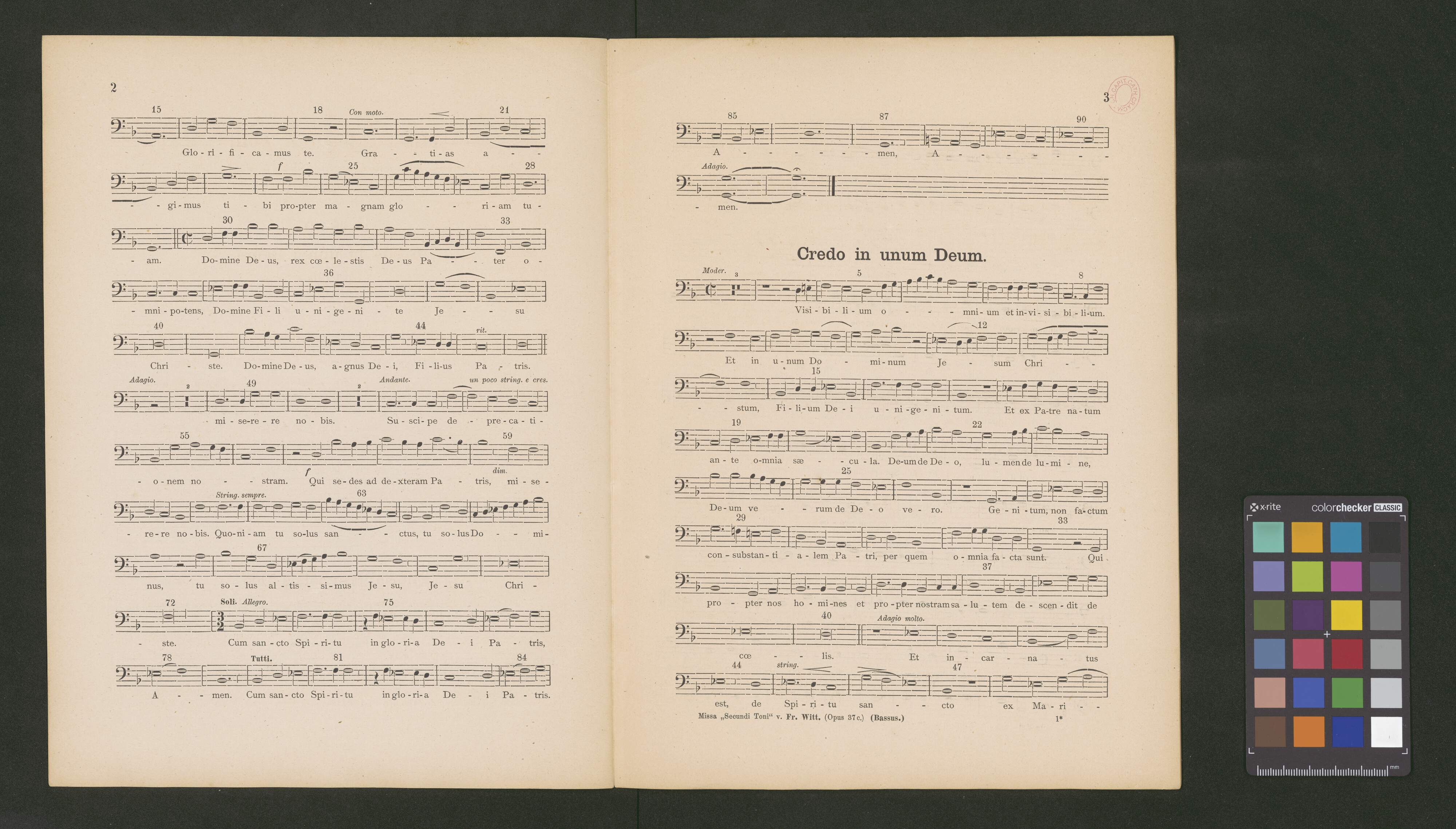 [cover page, score:] MISSA | "Secundi Toni" | ad | tres voces aequales cum Organo ad libitum. | Auctore | Francisco Witt. | Opus 37|c.| | MDCCCLXXXI. | Ratisbonae, Neo Eboraci & Cincinnatii.| Sumptibus, Chartis et Typis Friderici Pustet, | S. Apostolicae Sedis Typographi