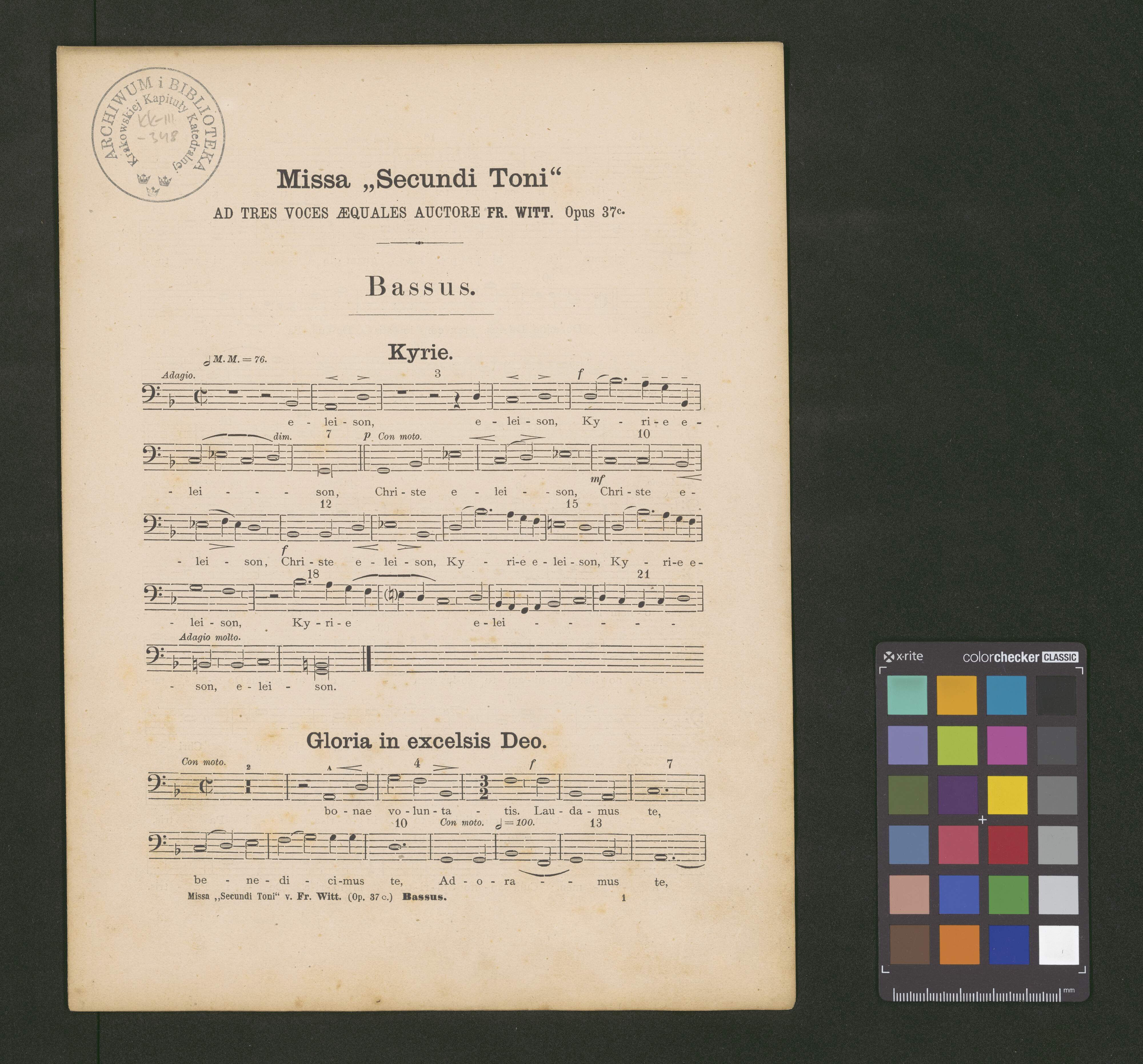 [cover page, score:] MISSA | "Secundi Toni" | ad | tres voces aequales cum Organo ad libitum. | Auctore | Francisco Witt. | Opus 37|c.| | MDCCCLXXXI. | Ratisbonae, Neo Eboraci & Cincinnatii.| Sumptibus, Chartis et Typis Friderici Pustet, | S. Apostolicae Sedis Typographi
