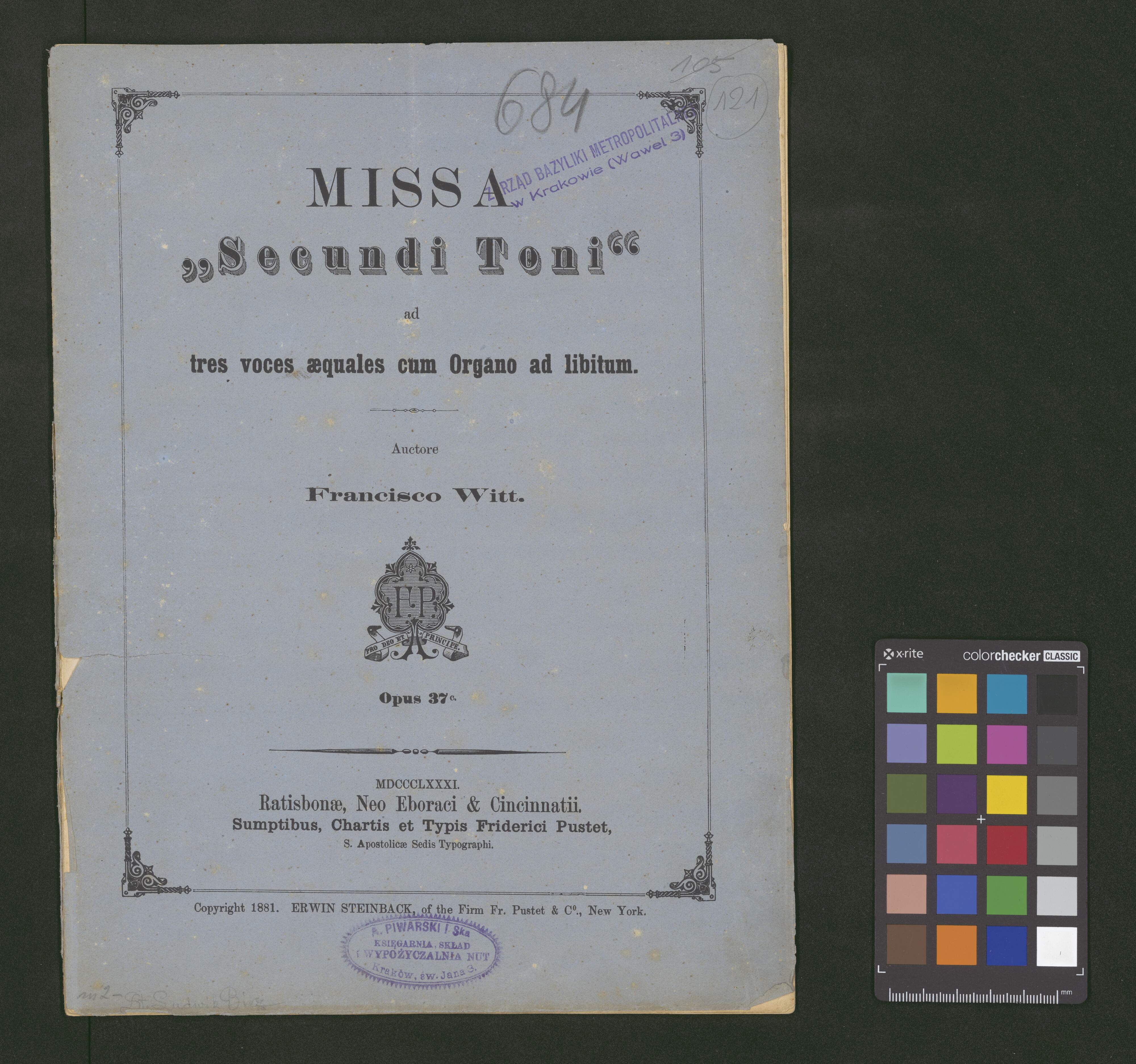[cover page, score:] MISSA | "Secundi Toni" | ad | tres voces aequales cum Organo ad libitum. | Auctore | Francisco Witt. | Opus 37|c.| | MDCCCLXXXI. | Ratisbonae, Neo Eboraci & Cincinnatii.| Sumptibus, Chartis et Typis Friderici Pustet, | S. Apostolicae Sedis Typographi
