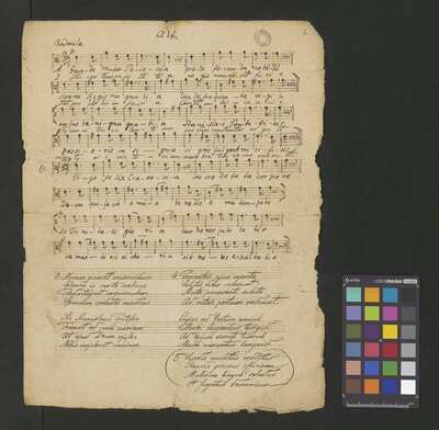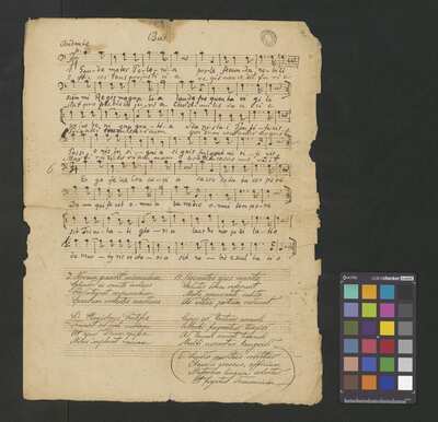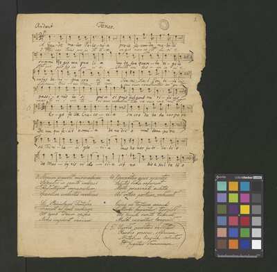 [pl-text: Pieczęć: „CATH. CRAC. * ARCH. CAPIT.” na wszystkich kartach.], [pl-text: Foliacja w źródle naniesiona ołówkiem.], [pl-text: Sygnatura naniesiona ołówkiem w lewym górnym rogu f. 1r. Poniżej tej sygnatury ślad po napisie "Ch. 181".], [pl-text: Pod zapisem nutowym w każdej partii zapisany tekst kolejnych zwrotek utworu.], [pl-text: Nazwy głosów w źródle w języku polskim.], [pl-text: Niewielkie ubytki w prawym brzegu kart.], [pl-text: Na odwrocie kart skreślony atramentem zapis tego samego utworu zapisanego w innej tonacji.]