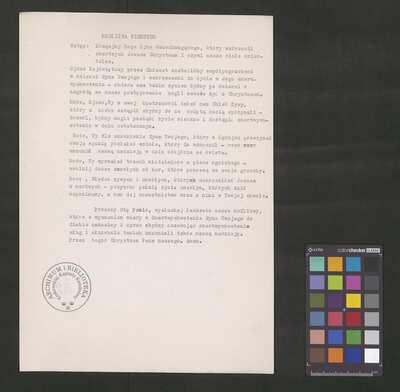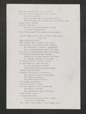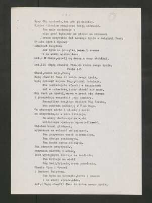 3 sacred songs, [pl-text: Druk nieprofesjonalny, odbitki.], [pl-text: Zbiór składa się z tekstów trzech utworów, według nich wydzielone zostały partie.], [pl-text: Pierwszy utwór zachowany w 21 odbitkach, drugi w 2 odbitkach, trzeci w 5 odbitkach.], [pl-text: Na niektórych odbitkach pojawiają się ręczne dopiski i poprawki w tekście.], [pl-text: Pieczęć okrągła o treści "ARCHIWUM I BIBLIOTEKA | Krakowskiej Kapituły Katedralnej | KK | -III-366/1" na stronie 2, ta sama pieczęć z końcówką 366/2 na stronie 3, a z końcówką 366/3 na stronie 5 wszystkich odbitek.], [pl-text: Mała, czerwona, owalna pieczęć "CATH. CRAC. * ARCH. CAPIT." w prawym górnym rogu stron 7, 9 i 11 wszystkich odbitek.]