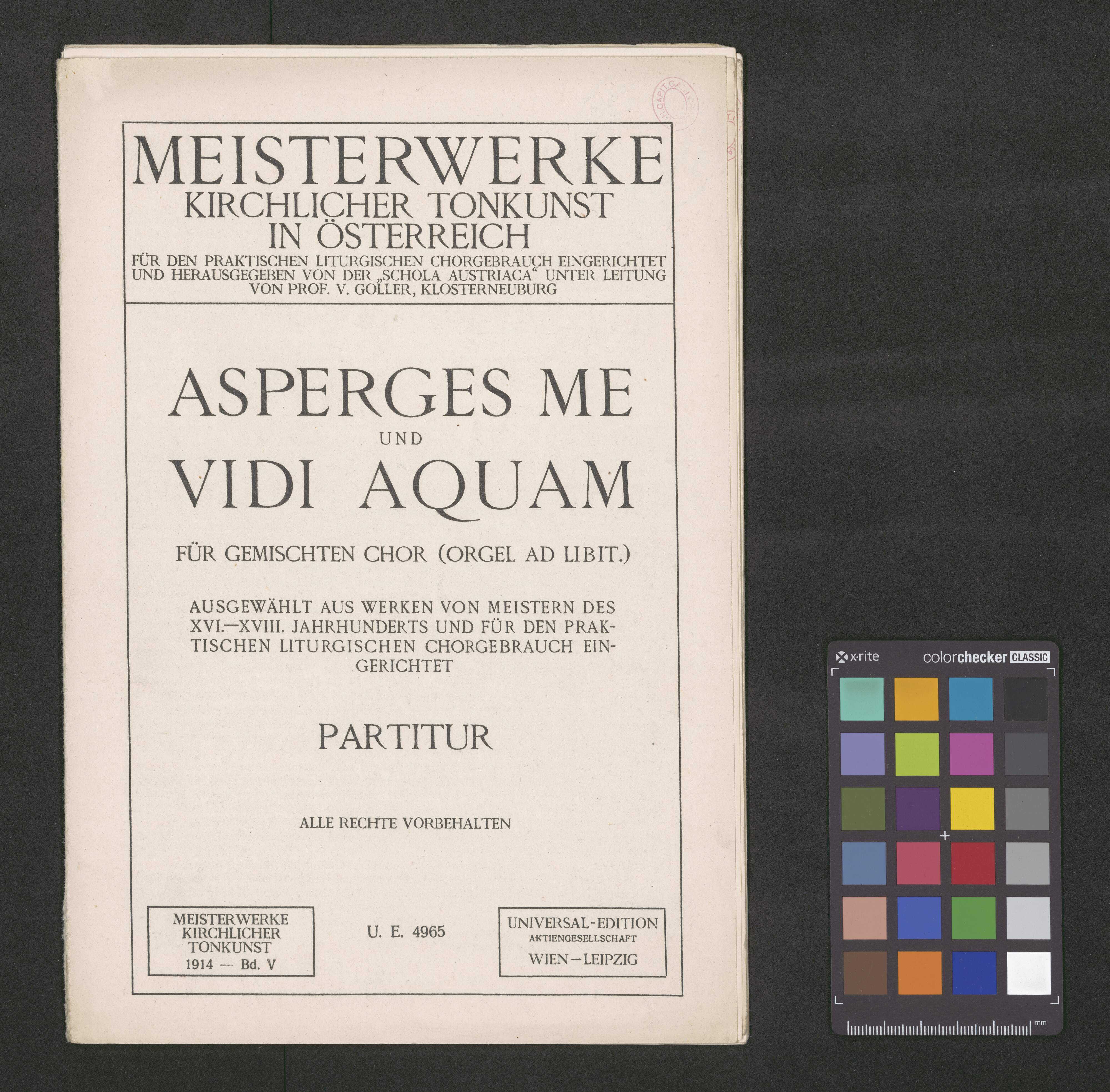 [title page:] MEISTERWERKE | KIRCHLICHER TONKUNST | IN ӦSTERREICH | FÜR DEN PRAKTISCHEN LITURGISCHEN CHORGEBRAUCH EINGERICHTET | UND HERAUSGEBEN VON DER "SCHOLA AUSTRIACA" UNTER LEITUNG | VON PROF. V. GOLLER, KLOSTERNEUBURG | ASPERGES ME | UND | VIDI AQUAM | FÜR GEMISCHTEN CHOR (ORGEL AD LIBIT.) | AUSGEWÄHLT AUS WERKEN VON MEISTERN DES | XVI.–XVIII. JAHRHUNDERTS UND FÜR DEN PRAK- | TISCHEN LITURGISCHEN CHORGEBRAUCH EIN- | GERICHTET | PARTITUR | ALLE RECHTE VORBEHALTEN | [at left:] MEISTERWERKE | KIRCHLICHER | TONKUNST | 1914 – Bd. V [center:] U. E. 4965 [at right:] UNIVERSAL-EDITION | AKTIENGESELLSCHAFT | WIEN – LEIPZIG
