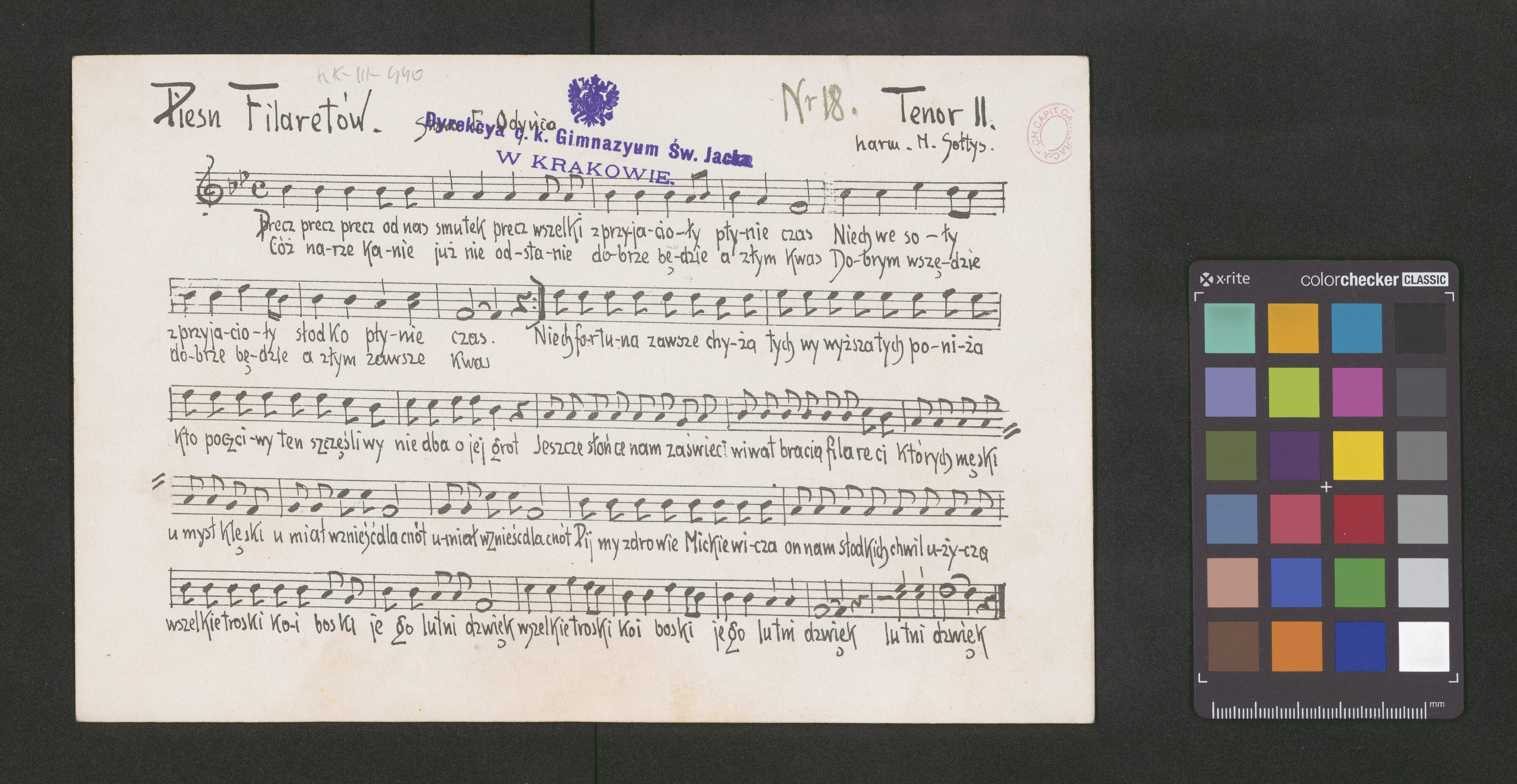 [caption title:] Pieśń Filaretów. | Słowa E. Odyńca [right:] Tenor I. | harm. M. Sołtys