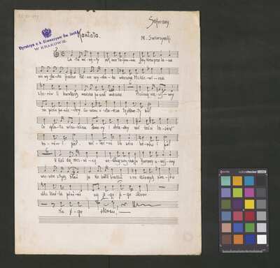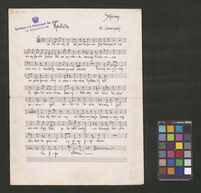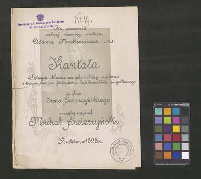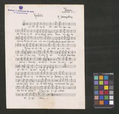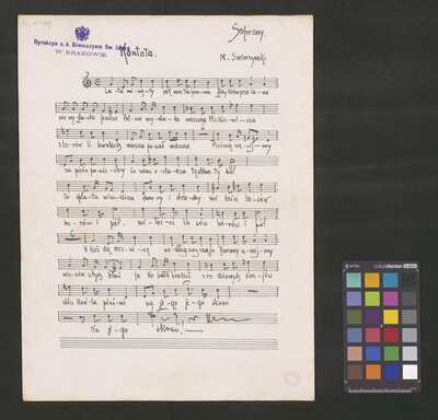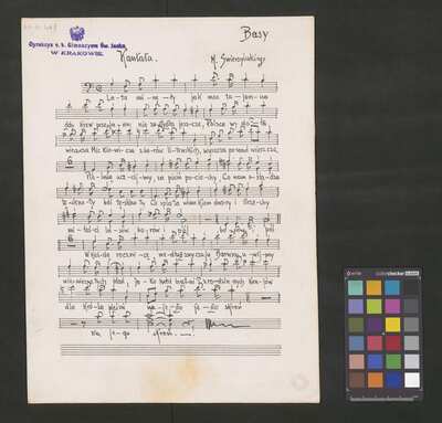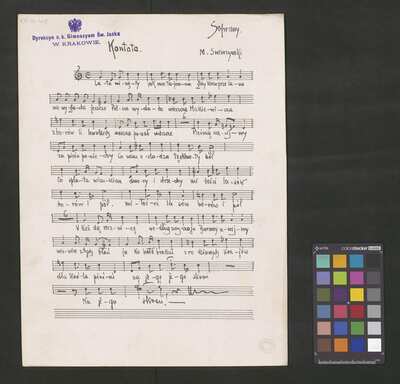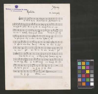 1 score, [pl-text: na niektórych stronach granatowa pieczęć: "[znak orła] Dyrekcya c. k. Gimnazyum Św. Jacka * W KRAKOWIE.", okrągła pieczęć: „ARCHIWUM I BIBLIOTEKA * Krakowskiej Kapituły Katedralnej” oraz owalna pieczęć: „CATH. CRAC. * ARCH. CAPIT.”], [pl-text: źródło obejmuje partyturę, opracowanie trzygłosowe (S, T, B) i dwugłosowe (T, B), a także kilkukrotny egzemplarz samej partii sopranu]