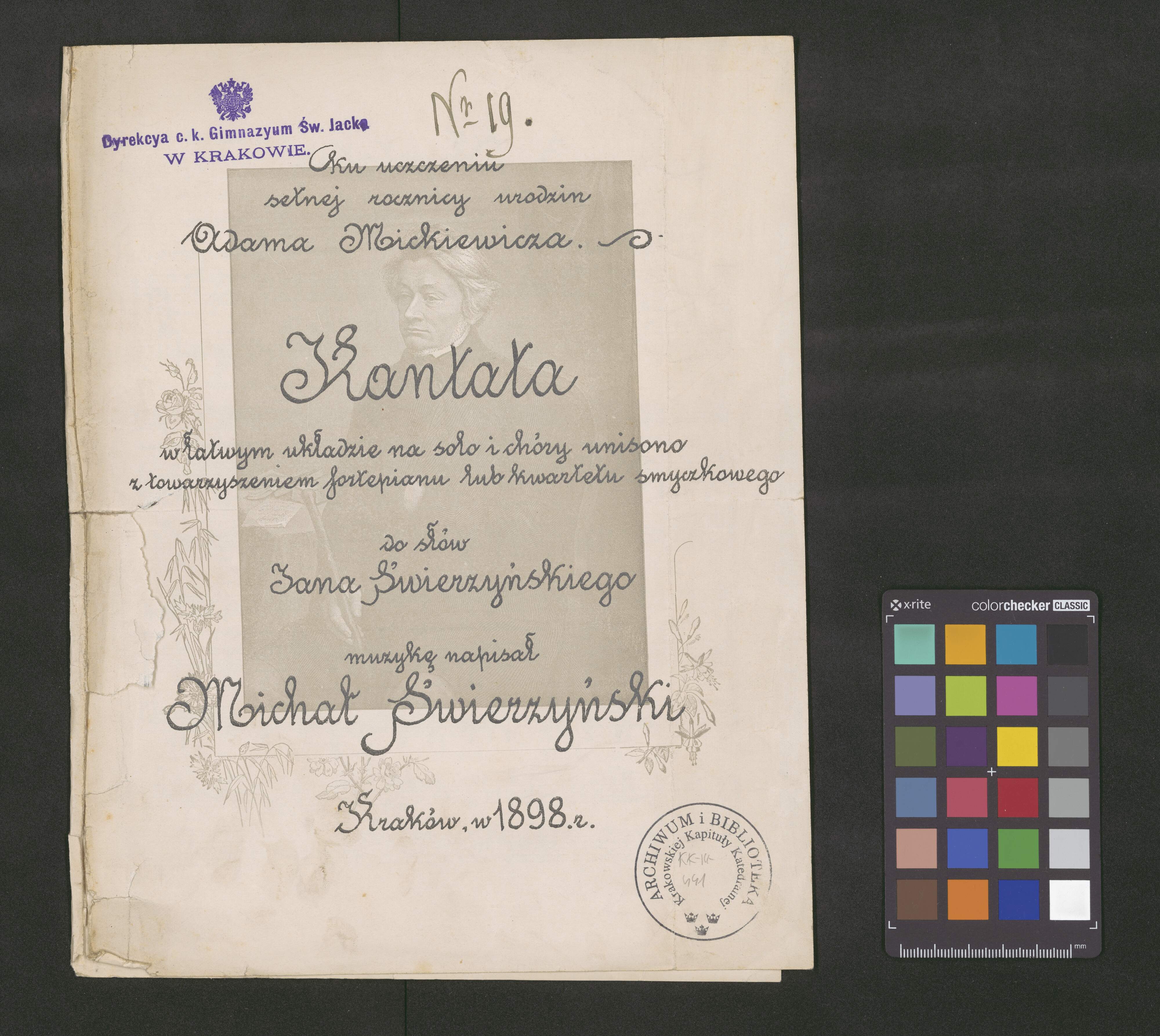 [page title:] Ku uczczeniu | setnej rocznicy urodzin | Adama Mickiewicza | Kantata | w łatwym układzie na solo i chóry unisono | z towarzyszeniem fortepianu lub kwartetu smyczkowego | do słów | Jana Świerzyńskiego | muzykę napisał | Michał Świerzyński | Kraków, w 1898. r