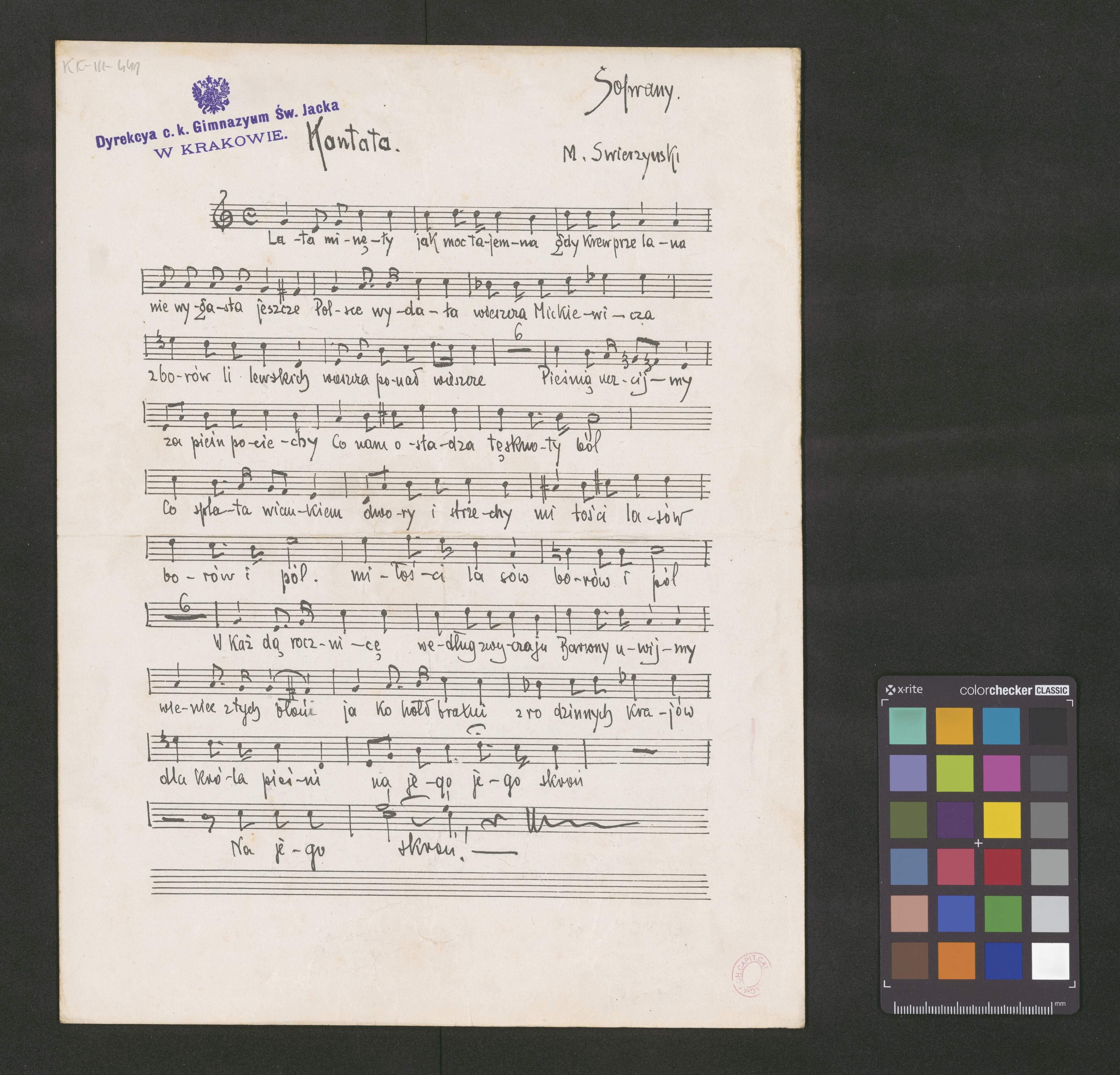 [page title:] Ku uczczeniu | setnej rocznicy urodzin | Adama Mickiewicza | Kantata | w łatwym układzie na solo i chóry unisono | z towarzyszeniem fortepianu lub kwartetu smyczkowego | do słów | Jana Świerzyńskiego | muzykę napisał | Michał Świerzyński | Kraków, w 1898. r