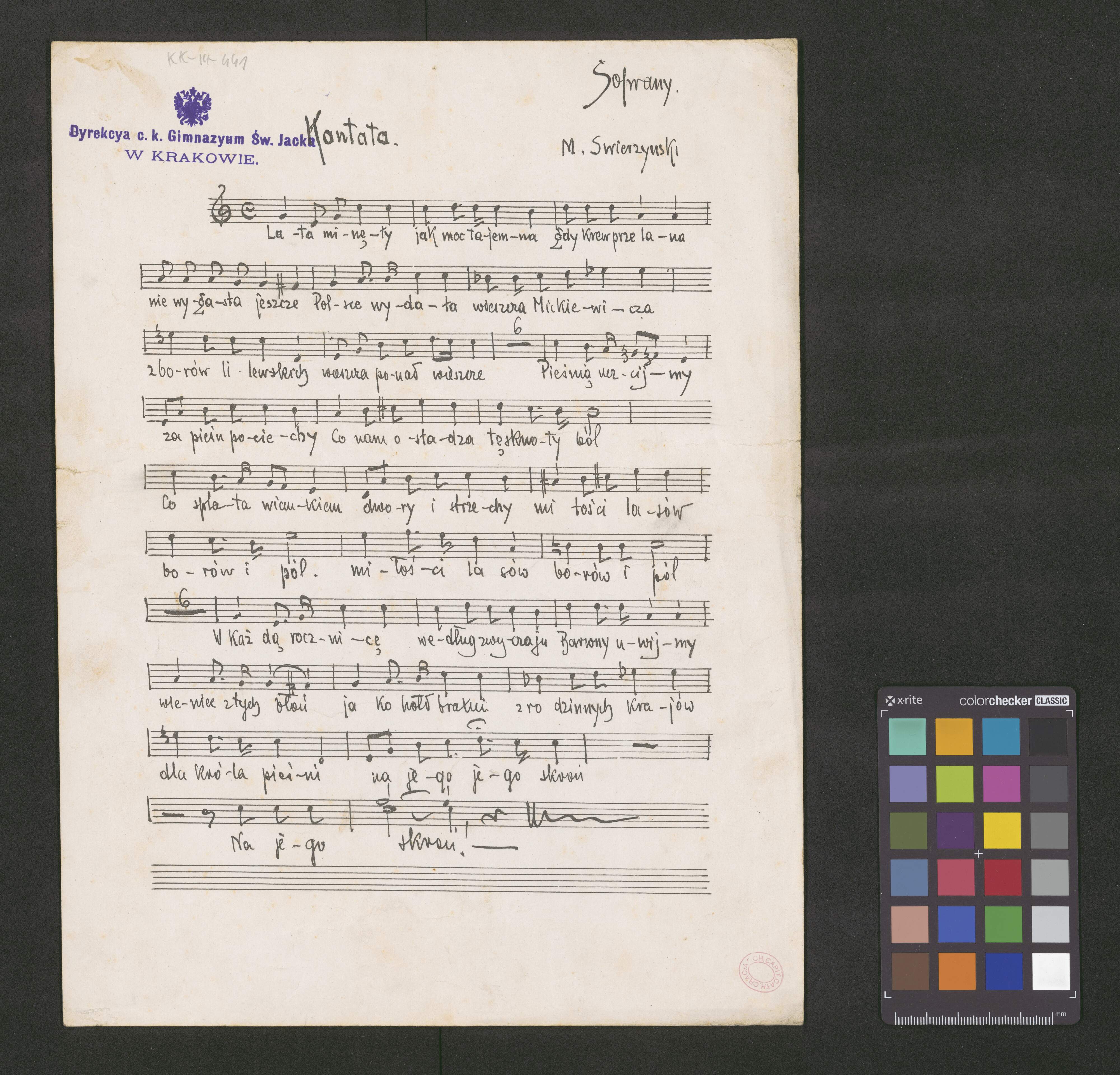 [page title:] Ku uczczeniu | setnej rocznicy urodzin | Adama Mickiewicza | Kantata | w łatwym układzie na solo i chóry unisono | z towarzyszeniem fortepianu lub kwartetu smyczkowego | do słów | Jana Świerzyńskiego | muzykę napisał | Michał Świerzyński | Kraków, w 1898. r