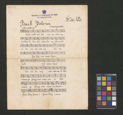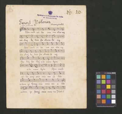 1 song, [pl-text: Fioletowa pieczęć z godłem Cesarstwa Austriackiego o treści "Dyrekcya c.k. Gimnazyum Św. Jacka | W KRAKOWIE." na pierwszej stronie każdego głosu.], [pl-text: Stara sygnatura "Nr 20." wpisana atramentem na pierwszej stronie każdego głosu.], [pl-text: Na pierwszej stronie każdego głosu wpisana ołówkiem sygnatura.], [pl-text: Pieczęć okrągła o treści "ARCHIWUM I BIBLIOTEKA | Krakowskiej Kapituły Katedralnej | KK-III- | 461" na stronie 1.], [pl-text: Mała, czerwona, owalna pieczęć "CATH. CRAC. * ARCH. CAPIT." na pierwszej stronie każdego głosu.]