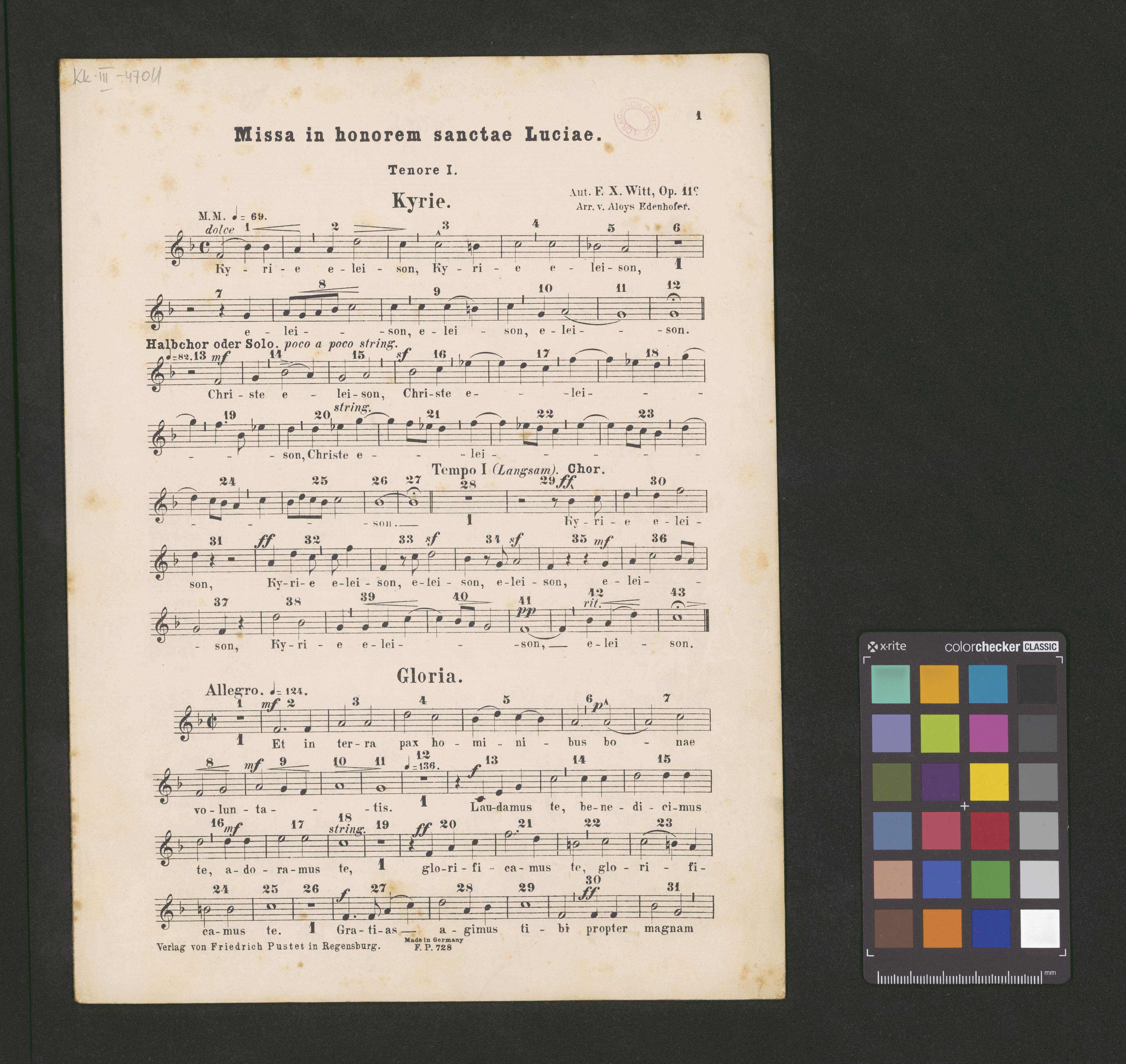 [title page:] MISSA | IN HONOREM S. LUCIAE | AUCTORE F. X. WITT. | OP. 11|c. | AD QUATUOR VOCES AEQUALES | COMITANTE ORGANO | CURAVIT | A. EDENHOFER | MUSICAE MAGISTER. | EDITIO ALTERA. | MDCCCLXXXVIII. | RATISBONAE, NEO-EBORACI ET CINCINNATII | SUMPTIBUS FRIDERICI PUSTET, | S. Sedis Apostolicae Typographi