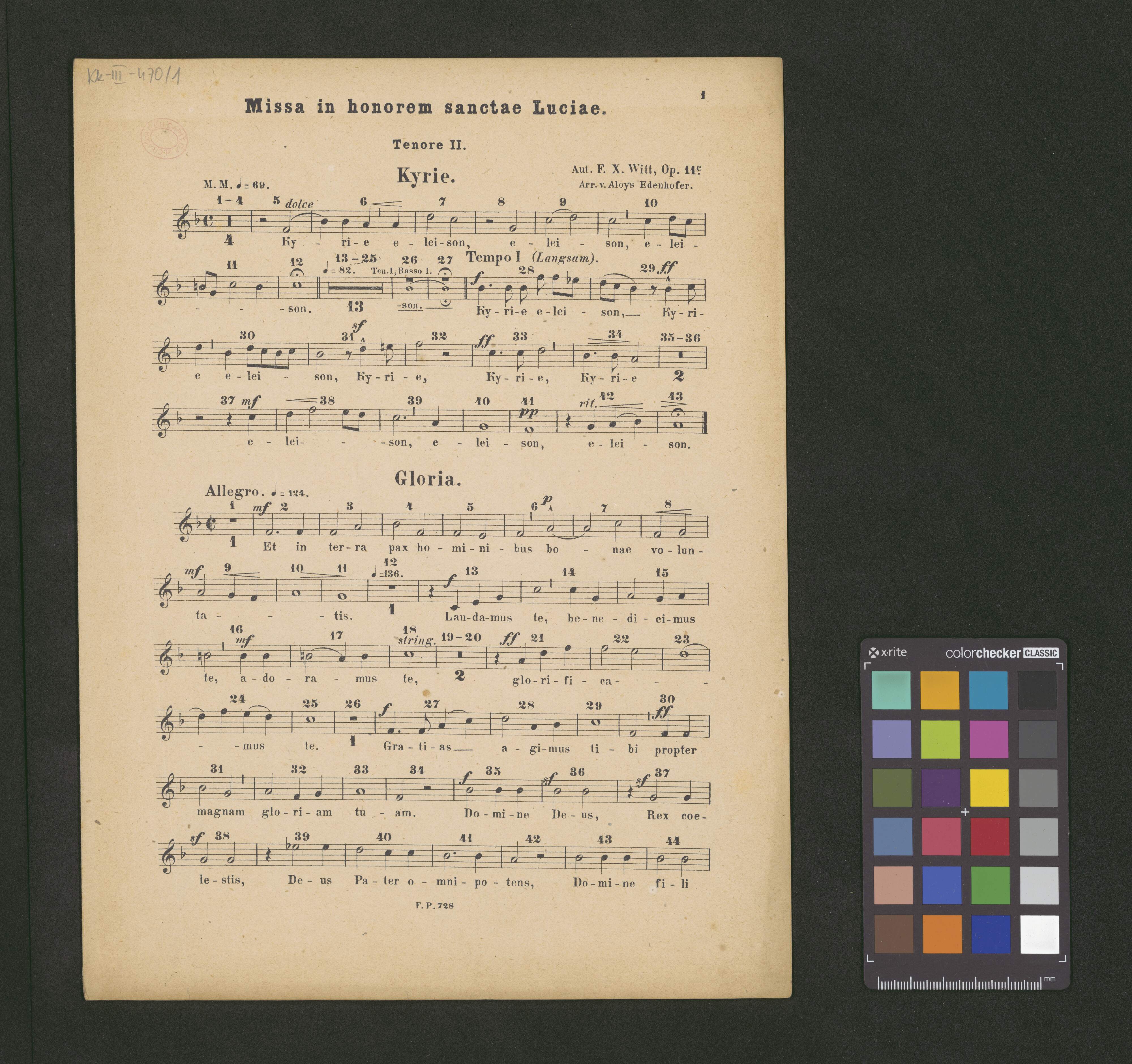 [title page:] MISSA | IN HONOREM S. LUCIAE | AUCTORE F. X. WITT. | OP. 11|c. | AD QUATUOR VOCES AEQUALES | COMITANTE ORGANO | CURAVIT | A. EDENHOFER | MUSICAE MAGISTER. | EDITIO ALTERA. | MDCCCLXXXVIII. | RATISBONAE, NEO-EBORACI ET CINCINNATII | SUMPTIBUS FRIDERICI PUSTET, | S. Sedis Apostolicae Typographi